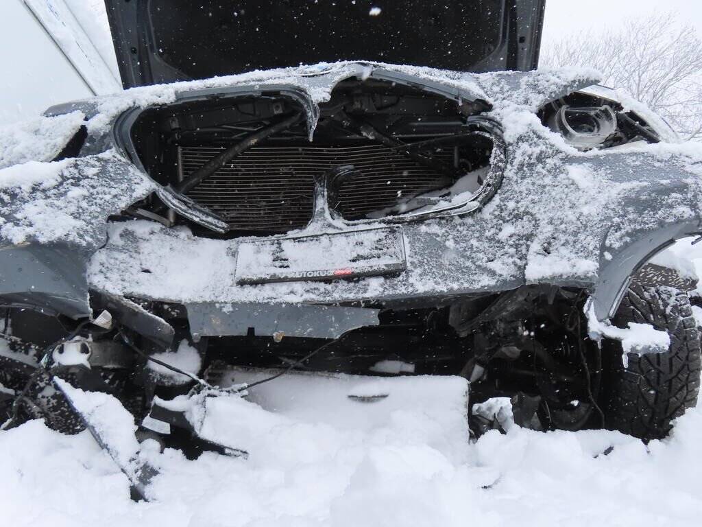 Pare-chocs avant, capot moteur, masque avant enfoncés.