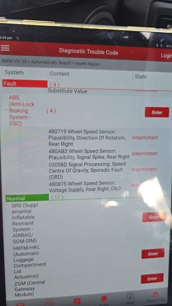 Delle und Verformung hinten rechts (Heckklappe / Seitenwand rechts hinten, Bereich Rücklicht). Möglicher Hagelschaden auf Dach und Fronthaube (Dellen). Meldung "Antrieb defekt" — vermutlich schwache Batterie. Diverse Fehlermeldungen im OBD-Scan: Raddrehzahlsensor hinten rechts defekt (ABS/DSC/DME/TCM-Fehler), Fahrstabilisierung-Warnung. Rechter Aussenspiegel: LIN-Kommunikationsfehler (kein Signal). Batterie sollte ersetzt werden.