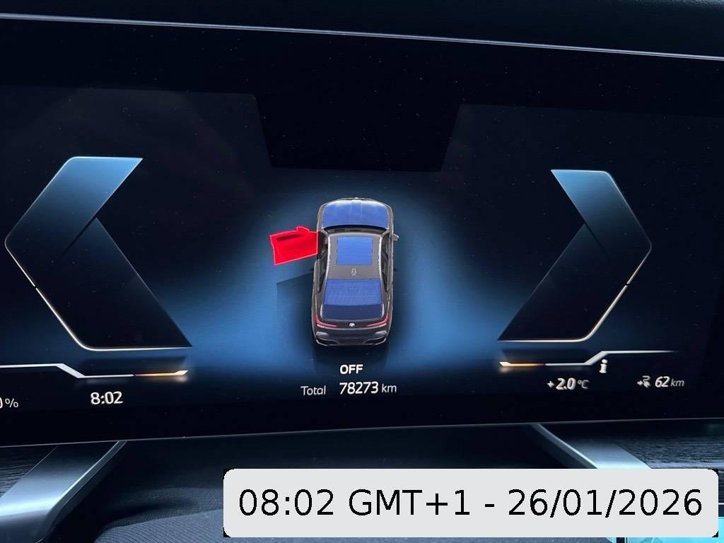 - Serial equipmentFensterheber, elektrisch - Einklemmschutz und Komfortöffnung/-schließung, Lenkrad: M Lederlenkrad, Integral-Aktivlenkung Anpassung des Lenkwinkels der Hinterräder für ein agileres Fahrverhalten sowie ein komfortableres Rangieren in Parksituationen., Panorama-Glasdach, Ambientes Licht, Active Guard Professional, Assist: Akustischer Fussgängerschutz, Teleservices, Assist: Crash-Sensor, Condition Based Service, Licht: Begrüssungslicht, Sonnenschutzrollos - Rollo für hintere Türseitenscheiben und Heckfenster, von unten nach oben elektrisch hochfahrend, geführt - Dreiecksfenster aus Fensterführungssteg elektrisch von oben nach unten ausschwenkend - Bedienung über Displays in Türinnenspiegel, Türen: Soft-Close-Automatik für Türen - Ermöglicht ein bequemes und sicheres Schliessen der Türen ohne viel Kraftaufwand und störende Zuschlaggeräusche. Versehentlich nicht richtig geschlossene Türen werden automatisch zugezogen., Assist: Aufmerksamkeitsassistent, Alarmanlage Zur Überwachung der Türen, Front- und Heckklappe, inklusive Innenraumschutz, Neigungsalarmgeber und Notstromsirene, inklusive Diebstahlsicherung, Assist: Dynamische Brems Control (DBC), Licht: Fernlicht-Assistent - Automatisches Ein- und Ausschalten des Fernlichtes abhängig von der Verkehrssituation - Steuerung über Sensor an der Vorderseite des Innenspiegels, Media: BMW Live Cockpit Plus - Anzeigeverbund bestehend aus einem volldigitalen Instrumentendisplay mit 12,3" und einem hochauflösendem Control Display mit 14,9" - BMW Operating System 8 - Navigationsfunktion - Intuitive Bedienmöglichkeiten - Fahrerprofil - Tuner mit Diversity-Empfang und RDS - USB-Anschlüsse - Bluetooth / WiFi Schnittstelle - 4G LTE Connectivity - Remote Software Upgrade, Flexible Fast Charger (Mode 2) Mobiles und flexibles AC-Heimladegerät für alle Elektrofahrzeuge. - AC-Ladeleistung Haushaltssteckdose 2,3 kW, AC-Ladeleistung Industriesteckdose bis zu 11 kW - automatische Ladestromanpassung - wasserdicht - inklusive Adapterkabel für Haushaltssteckdosen (6 m) und Kabeltasche Wandhalterung sowie weitere wechselbare Adapterkabel für Haushalts- und Industriesteckdosen optional erhältlich., BMW Garantie: Repair Inclusive 4 Jahre oder 200'000 km - es gilt das zuerst Erreichte., Türen: Automatische Heckklappenbetätigung Fernöffnen mit Schlüssel, Schliessen über Heckklappentaster und Fernbedienung., Ladekabel (Mode 3) - AC-Laden an öffentlichen Ladesäulen für Typ2-Märkte - 22 kW (3-phasig) - Kabellänge: 5m - Aufbewahrung in Tasche im Gepäckraum - länderspezifisches Angebot beachten: relevant für 1-phasige Märkte und Fahrzeuge mit 22kW AC SA, Active Protection Sicherheitspaket zur Einleitung von Schutzmaßnahmen für die Insassen in drohenden Unfallsituationen: - reversible Gurtstraffung (länderabhängig) - automatisches Schließen der Fenster bis auf einen Spalt - bei Komfortsitz: Positionierung Rückenlehne von Beifahrersitz und Fondsitzen - inklusive Aufmerksamkeitsassistent, Innenbeleuchtung, Sitze: Sitzverstellung, elektrisch mit Memory - Elektrisch verstellbar: Sitzhöhe, Lehnenneigung, Sitzposition, Sitzflächenneigung - Fahrersitz mit Sitzmemory, 2 Positionen speicherbar inklusive Spiegelposition - Aussenspiegel: Memoryfunktion, Bordsteinautomatik, Paket: Connected Package Professional, Media: DAB+ Tuner, Fahrwerk: Adaptive 2-Achs Luftfederung, Paket: Erweitertes Außenspiegelpaket - elektrisches Heranklappen auf Knopfdruck - Fahreraußenspiegel mit automatischer Abblendfunktion, Räder: Reifendruck-Kontrolle, Klima: Klimatisierungsautomatik 4- Zonen Vollautomatische Temperaturregelung mit Temperaturschichtung und Luftmengenregelung. Die Steuerung erfolgt jeweils über Displays für Fahrer/Beifahrer und Fondinsassen, Assist: Auto-Hold-Funktion, M Sport Exterieurumfänge - Nierenrahmen in Chrom - Stoßfängerverkleidung vorn und hinten mit eigenständigem Design in Wagenfarbe, mit Einsätzen in Schwarz hochglänzend - Zierblenden in Schwarz hochglänzend bzw. Aluminium satiniert - Seitenschwellerverkleidungen mit eigenständigem Design in Schwarz hochglänzend - M Kennzeichnung an den Seiten - Einstiegsleisten vorn mit Aluminiumeinleger und M Schriftzug - Schlüssel mit M Kennzeichnung, Media: BMW Live Cockpit Professional - Anzeigeverbund bestehend aus einem volldigitalen Instrumentendisplay mit 12,3" und einem hochauflösendem Control Display mit 14,9" - BMW Operating System 8 - Full-Color Head-Up Display mit konfigurierbaren HUD-Inhalte - Navigationsfunktion - Intuitive Bedienmöglichkeiten - Fahrerprofil - Tuner mit Diversity-Empfang und RDS - USB-Anschlüsse - Bluetooth / WiFi Schnittstelle - Remote Software Upgrade, M Hochglanz Shadow Line mit erweiterten Umfängen, BMW Mobile Care, Assist: Driving Assistant Radarbasiertes Fahrerassistenzsystem bestehend aus: Spurwechselwarnung, Querverkehrswarnung hinten mit Bremseingriff, Safe Exit, Prävention Heckkollision, Steckdose - 2 x 12 V (in Gepäckraum und Mittelkonsole vorn) - 2 x USB-C-Anschlüsse zum Laden und zur Übertragung von Daten (Mittelkonsole vorn) - 2 x USB-C-Anschlüsse zum Laden (Mittelkonsole hinten), BMW IconicSounds Electric - steigert die Fahrfreude durch ein markantes akustisches Antriebsfeedback - Inszenierung des Antriebsounds über CID aktivierbar - Abstufung über die FES Modi: Sport: deutliches Lastfeedback Comfort: ausgewogener Akustikkomfort mit leichtem Lastfeedback Eco-Pro: hoher Akustikkomfort ohne zusätzliche Inszenierung, Lenkrad: Lenksäule elektrisch einstellbar, Media: BMW Natural Interaction - Verbindung von Sprache, Gestik und Blick für ein natürliches und barrierefreies Interaktionserlebnis. Der Fahrer kann mit sämtlichen POIs (Gebäude, Tankstellen, Ladesäulen, etc.) interagieren, indem er darauf zeigt und über einen Sprachbefehl weitere Informationen einfordert., Sitze: Sitzheizung vorne und hinten, Licht: Heimleuchten, M Heckspoiler, Media: ConnectedDrive Services, Sitze: Seriensitz für Fahrer und B