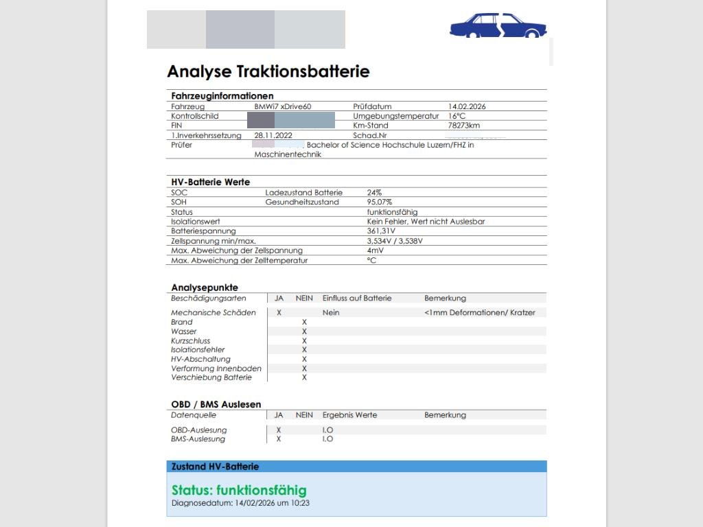 - More InformationDie Hochvoltbatterie wurde geprüft und ist funktionsfähig. Das Fahrzeug wird mit der HV-Batterie verkauft.Die (vom Fahrzeugexperten) ermittelten Reparaturkosten beziehen sich auf das versicherte Ereignis. Allfällige zusätzliche, nicht versicherte Schäden/Vorschäden, sind in den Reparaturkosten nicht enthalten. Die deklarierten Ausstattungsmerkmale können von der effektiven Ausstattung abweichen.AchtungBei einem Hochvoltsystem - Spannungsfreiheit prüfen. Sicherheitshinweise und Betriebsanleitungen des Herstellers konsultieren und befolgen. Das Fahrzeug steht beim nachfolgend aufgeführten Standortbetrieb und muss vor Gebotsabgabe besichtigt werden.Bitte melden Sie Ihren Besuch beim Standortbetrieb telefonisch an:Autoverwertung Müller AGLuzernerstrasse 406144 Zell LU041 988 19 87