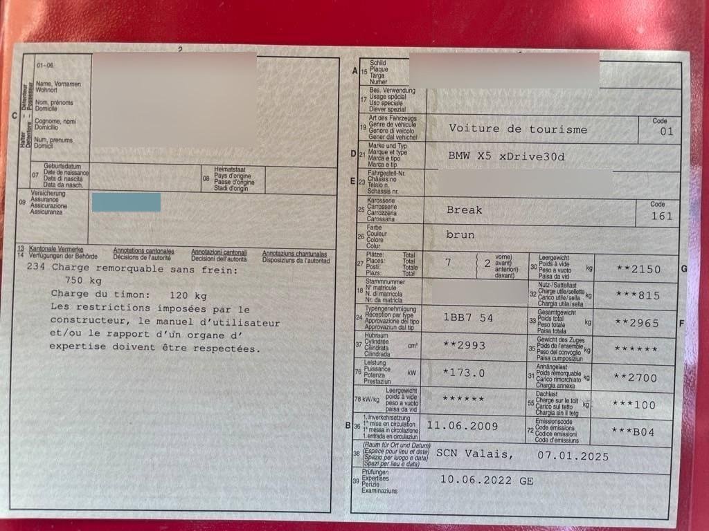 - Serial equipmentVerbandskasten, Schliesshilfe für Heckklappe, Info-Display, Aufklappbare Heckscheibe, Klimatisierungsautomatik, Vordersitze mechanisch längsverstellbar, Getriebe: 6-Stufen-Automat Steptronic, Lenkrad: Lenkrad längs- und höhenverstellbar, Mittelarmlehne vorne, Wegfahrsperre elektronisch, Lenkrad und Schalthebelgriff in Leder, Digital Uhr, Laderaumabdeckung, Gepäckraumboden abschliessbar, Innen- und Aussenspiegel automatisch abblendend, Leuchtweitenregulierung von innen, 2 Steckdosen in der Mittelkonsole (vorne und hinten), Abblendlichtausschaltverzögerung 'Follow me home', Geteilte Heckklappe, Assist: Tempomat mit Bremsfunktion, Scheibenwischer vorne mit Intervall, Elektronische Differentialsperre (ADB-X), Stereolautsprechersystem mit 6 LS, Wartungsintervall-Anzeige, Pollenfilter (Staubfilter), Stossstangen und Aussenspiegel in Wagenfarbe, Interieurleisten Graphitan matt, Automatische Stabilitäts-Control (ASC), Fussraumbeleuchtung vorne, Start-/Stop-Knopf, Airbag: Airbag Fahrer und Beifahrer, Check-Control-System, Airbag: Seitenairbag für Fahrer und Beifahrer, Park Distance Control vorne und hinten, iDrive-System, Stoff-Ausstattung, Aux-In Anschluss, Nebelscheinwerfer, Beide Make up-Spiegel beleuchtet, Reifen mit Notlaufeigenschaft, Veloursfussmatten vorne und hinten, Drittes Bremslicht, Steckdose im Kofferraum, Dynamische Stabilitätskontrolle (DSC), Handschuhfach, Antiblockiersystem (ABS), Elektronische Parkbremse, Bordcomputer, Assist: Anfahrassistent, Oelstandsanzeige, Frontscheibe Verbundglas, Heckscheiben-Wisch-/Waschanlage, Aussenspiegel rechts und links beheizbar und elektrisch verstellbar, Hill Descent Control (HDC), Elektrische Fensterheber vorne + hinten, Bremsbelag-Verschleissanzeige, Gurtstraffer vorne, Mittelarmlehne hinten, Allradantrieb permanent, Reifendruckverlust-Warnsystem, Lichtwarnsummer, Befestigungsösen im Laderaum, Tagfahrlicht, Rücksitzlehne geteilt abklappbar, Vordersitze mit elektrischer Höhen-, Lehnen-, und Neigungseinstellung, Automatische Umluftkontrolle, Höhenverstellbare Gurten vorne, Sitzbelegungserkennung für Beifahrersitz, Abschliessbare Radschrauben, Zentralverriegelung mit Fernbedienung, Nichtraucherausführung, Servolenkung geschwindigkeitsabhängig, Lenkrad: Multifunktionslenkrad, Scheibenwaschdüsen beheizt, Window-Kopfairbags, Tageskilometerzähler, Leseleuchten vorne, Seitenaufprall-Schutzsystem, Bremsassistent (BAS), Grün getönte Scheiben, 3 Kopfstützen hinten, Drehzahlmesser, Anbauteile in Wagenfarbe, Radio BMW Professional, Aktive Kopfstützen, Aussentemperaturanzeige, Aktivkohlefilter (Geruchsfilter), Sicherheitstrennnetz oder /-gitter im Gepäckraum, Partikelfilter und Oxydationskatalysator, Cupholder vorne und hinten, ISOFIX Kindersitzvorrichtung, Lackierung: Uni-Lackierung, Assist: Cornering Brake Control (CBC), Armlehne vorne mit Ablagefach, Licht: Nebelschlussleuchte, Leichtmetallfelgen im Sternspeiche 209 18J mit Pneu, Ausstiegsleuchten in den Türen, Version 7: Orte