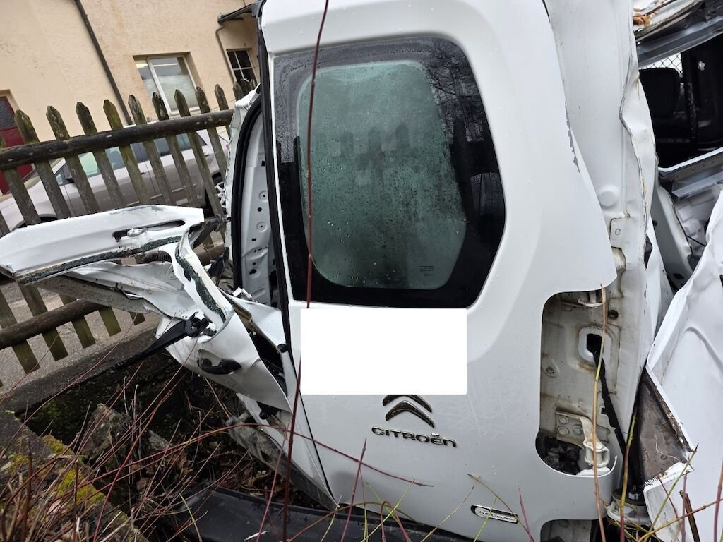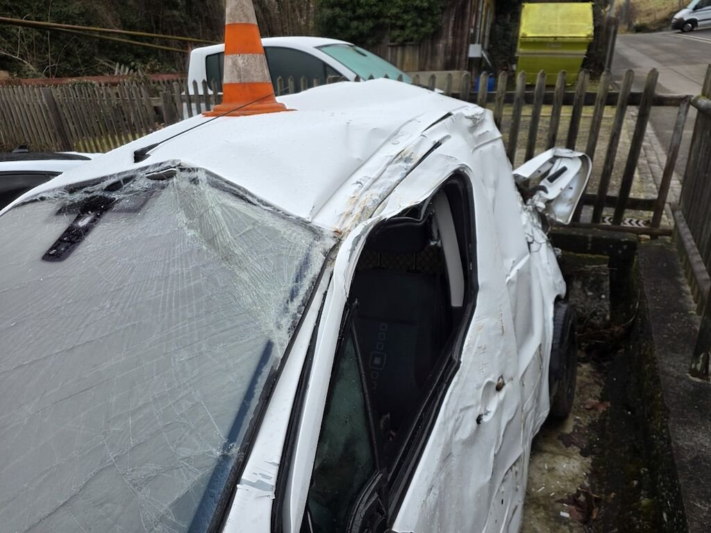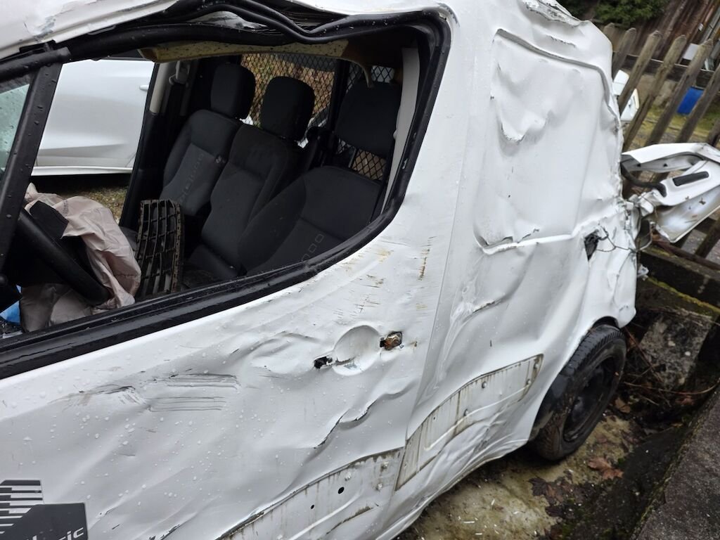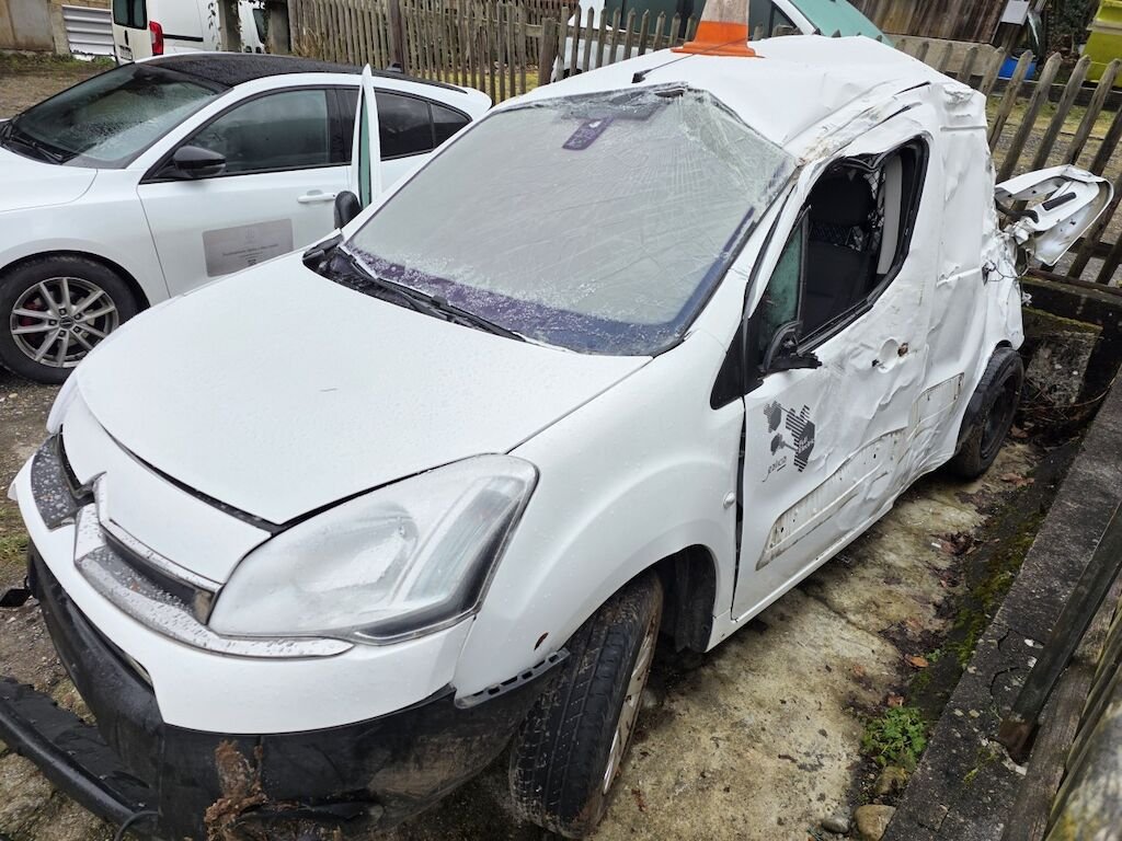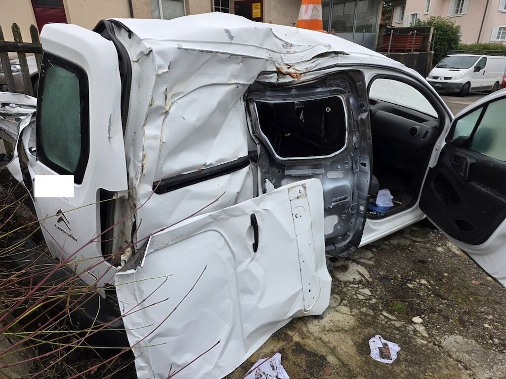 Fahrzeug hat sich mehrfach überschlagen, rundum beschädigt inklusive Achsen und Unterboden.
