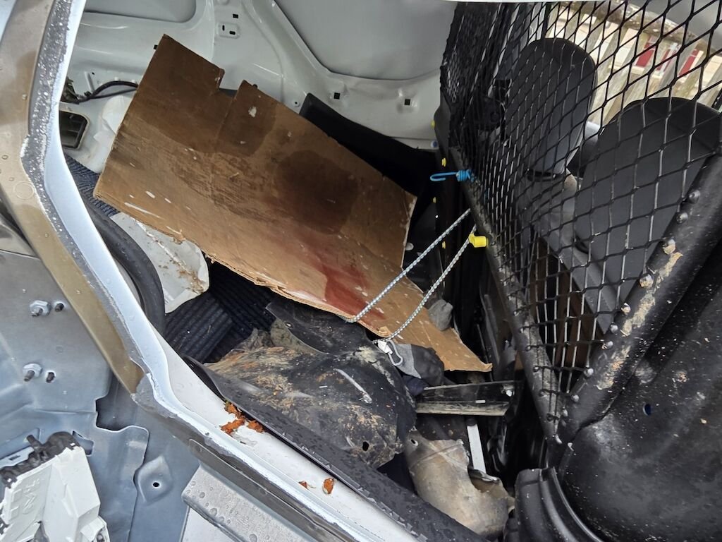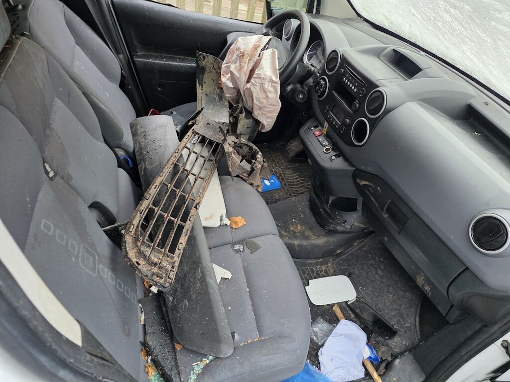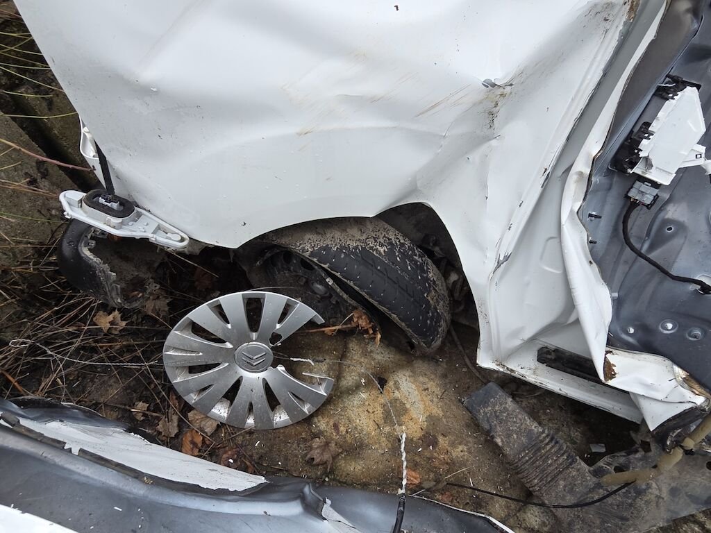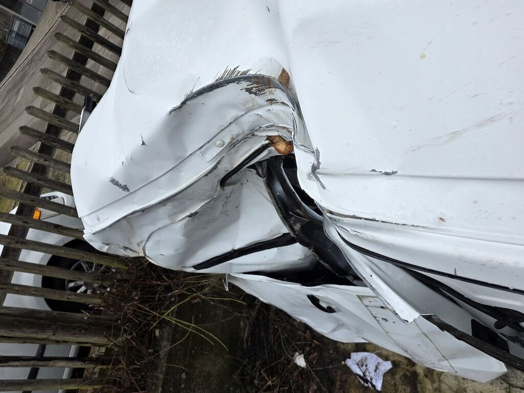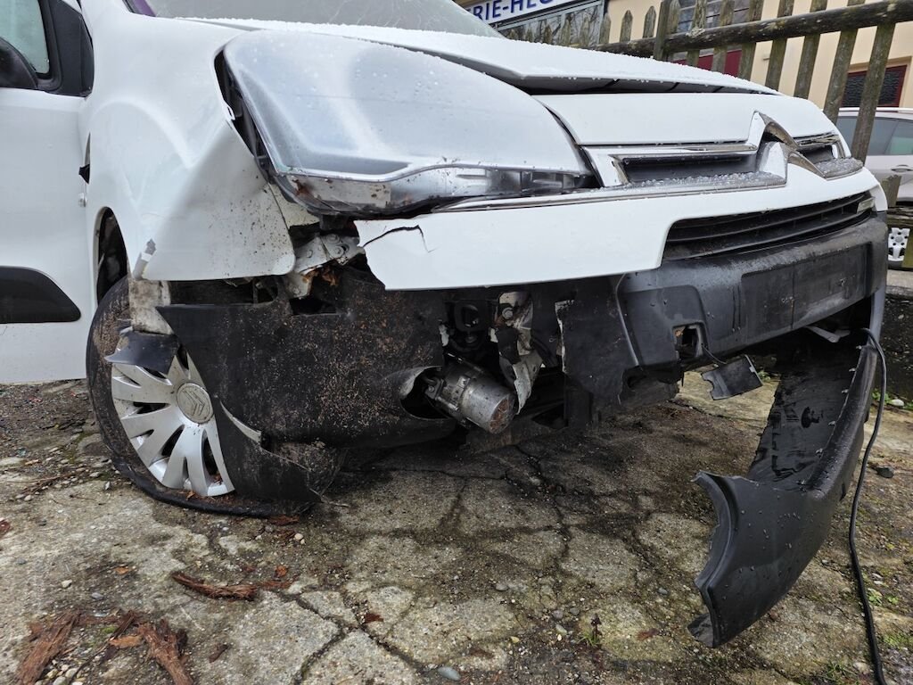 Fahrzeug hat sich mehrfach überschlagen, rundum beschädigt inklusive Achsen und Unterboden.
