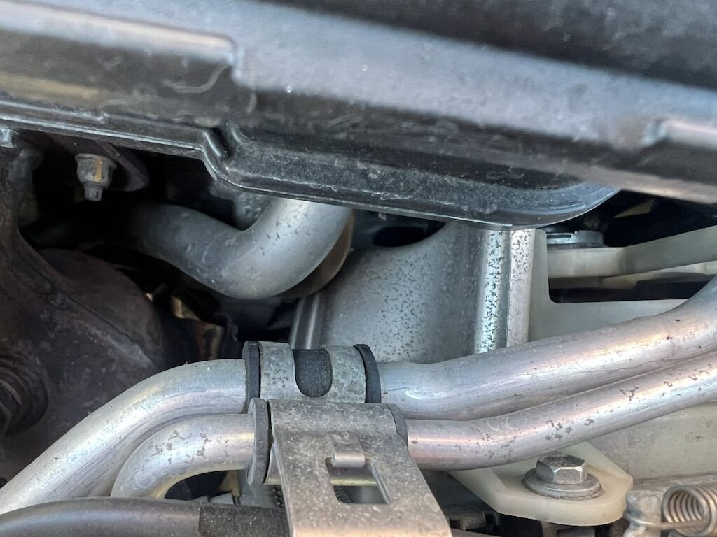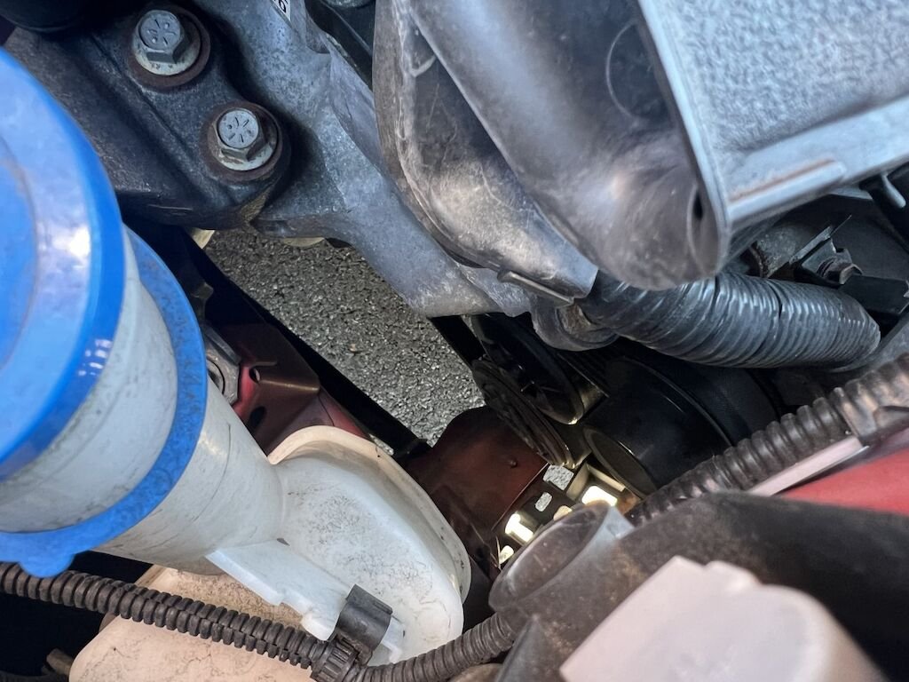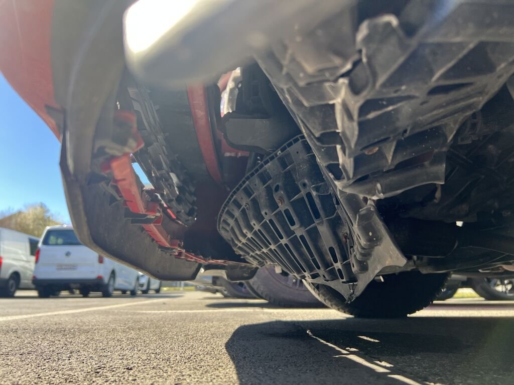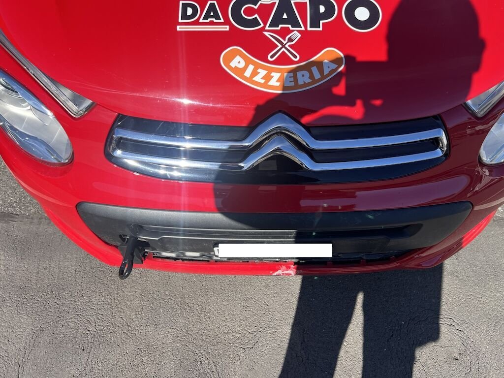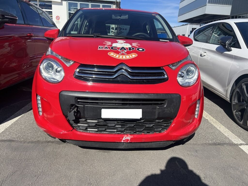 Frontverkleidung mit Ambauteilen, Luftführungen, Querträger und Frontmaske unten, etc. beschädigt. Kühlerpacket mit Lüfter nach hinten gedrückt. Motor läuft, Kompressor steht aber am unter Querträger an.