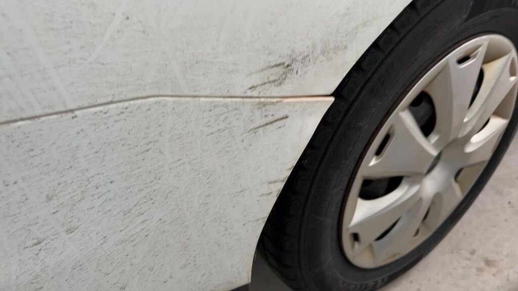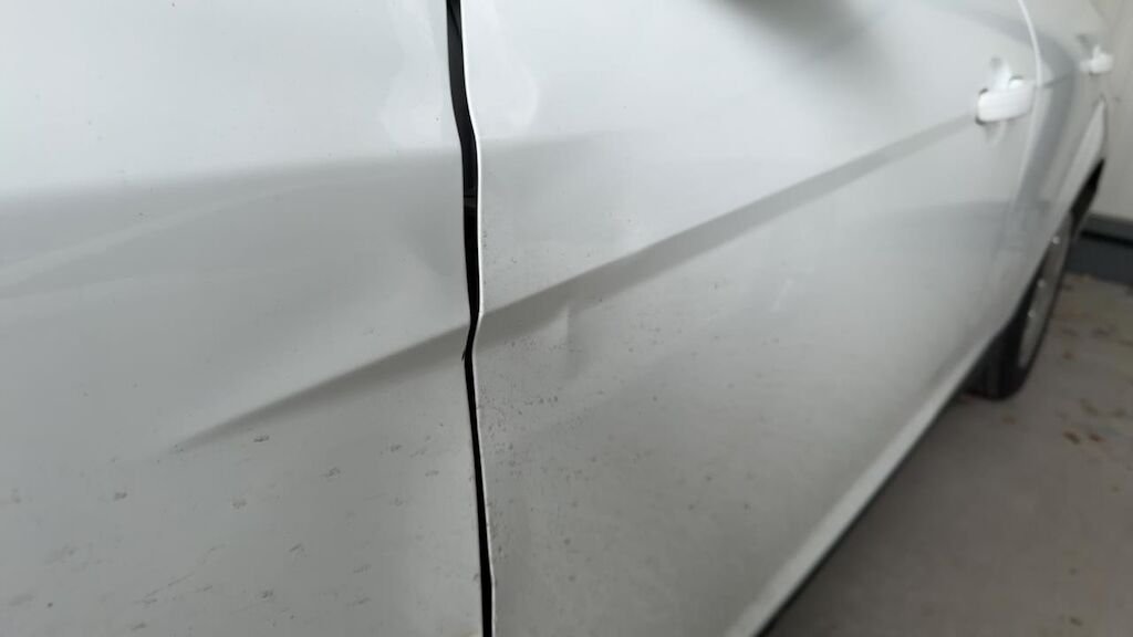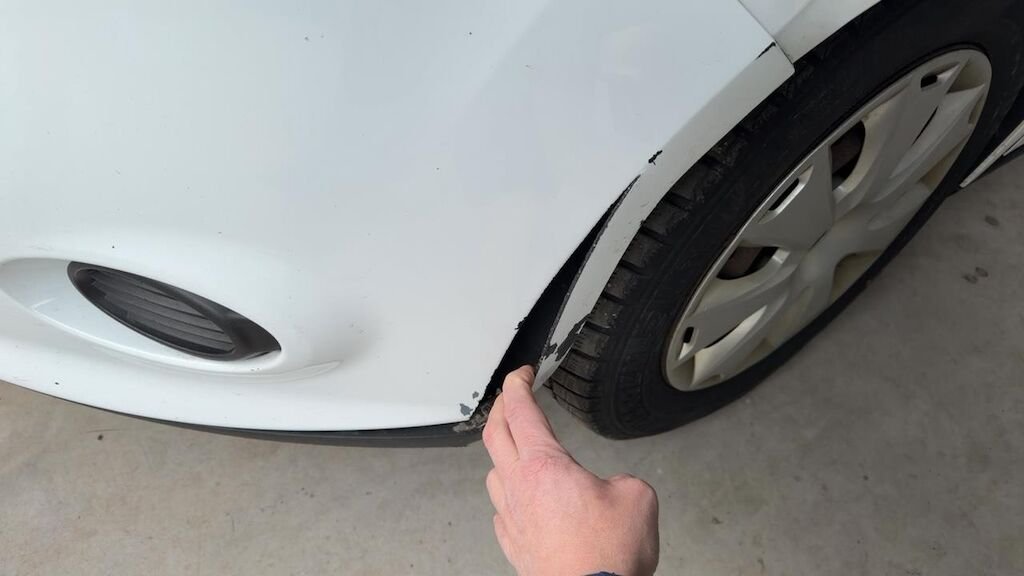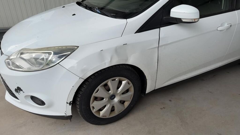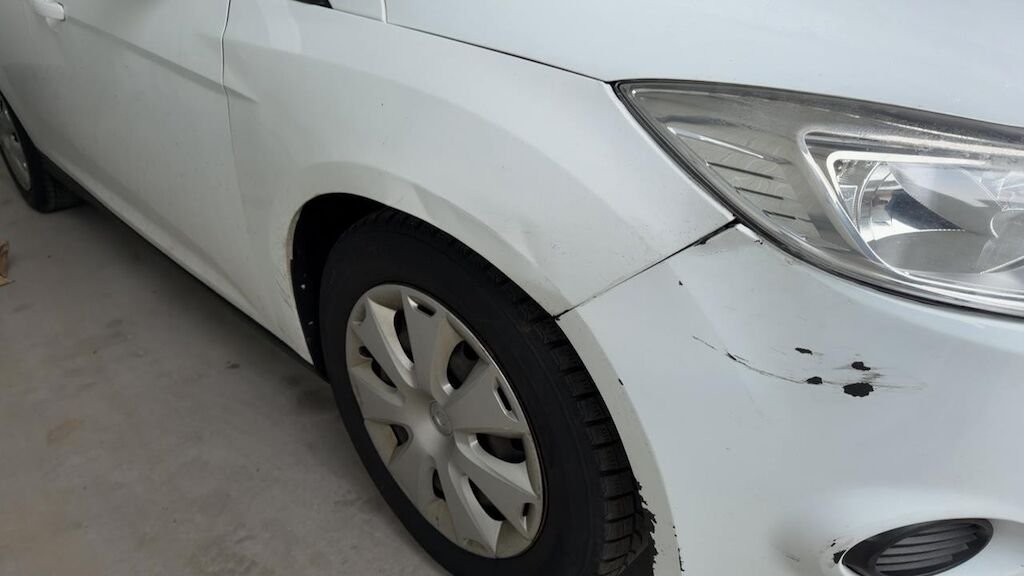 Dommage flanc avant droit: aile pliée déformée emboutie enfoncée endommagée.