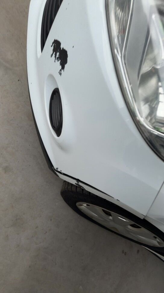 Dommage flanc avant gauche: aile porte pliées déformées embouties enfoncées endommagées, angle d'enveloppe de pare chocs cassé arraché endommagé.