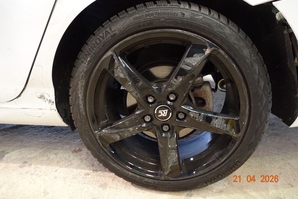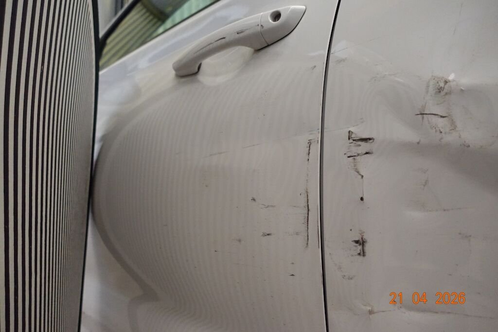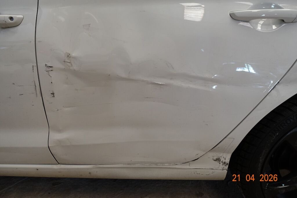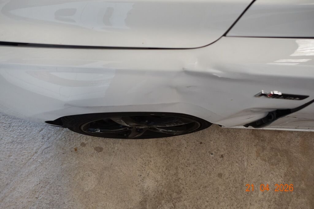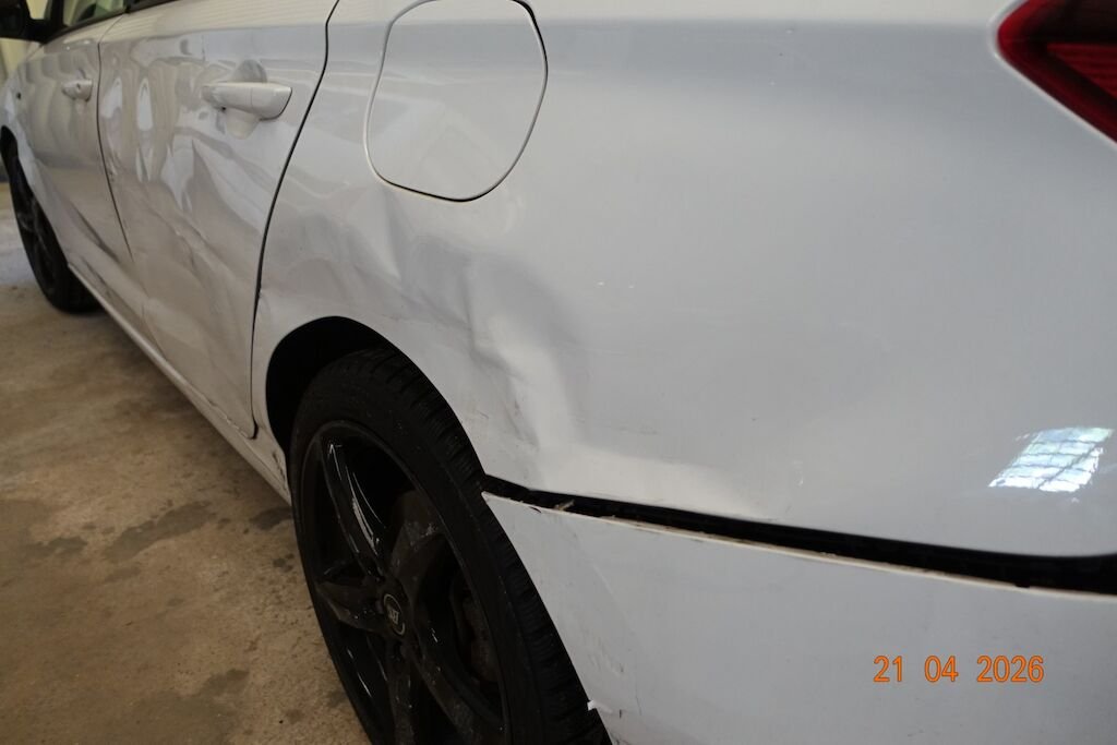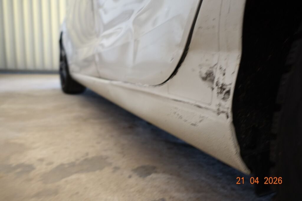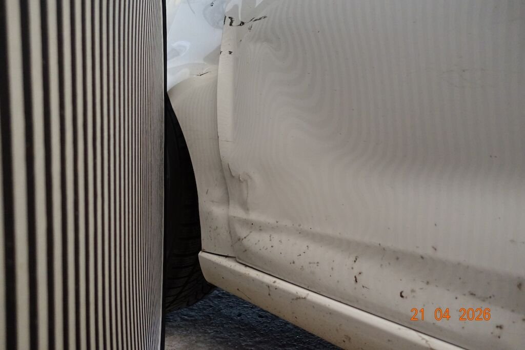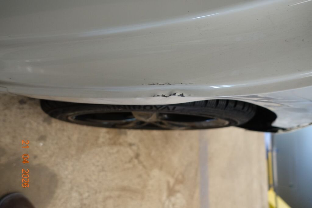Die komplette linke Fahrzeugseite ist eingedrückt. Das Fahrwerk sowie die Felgen L sind ebenfalls beschädigt.