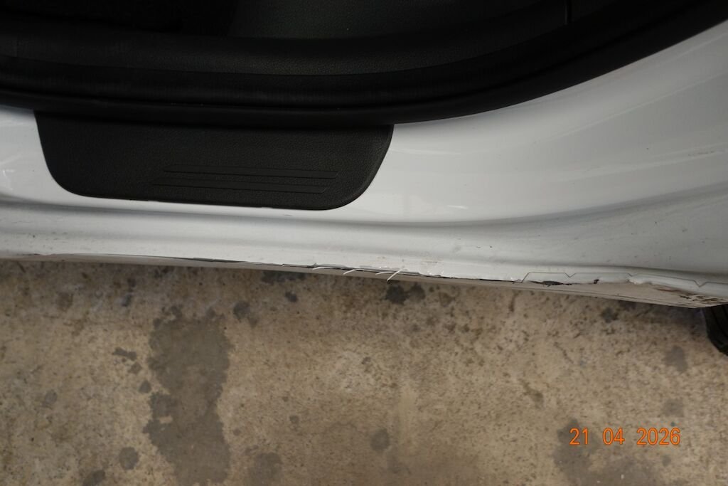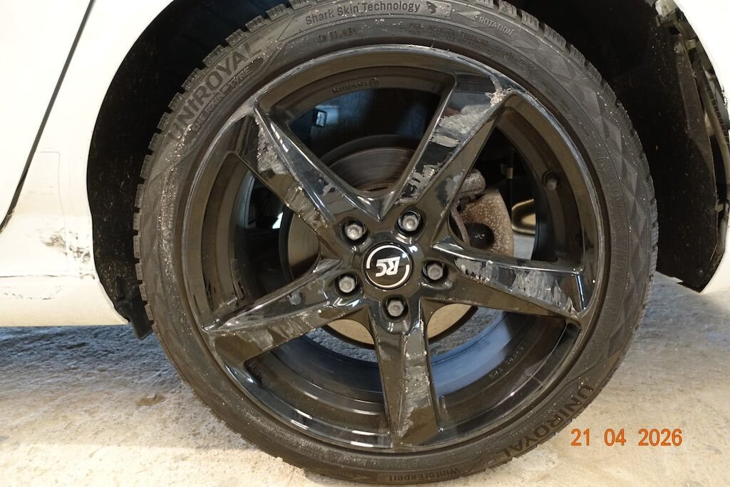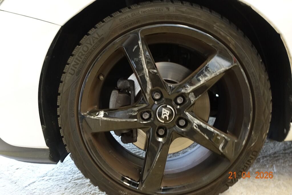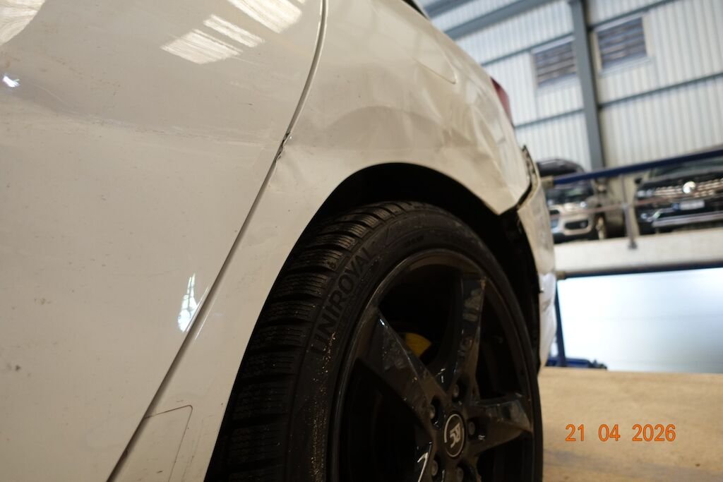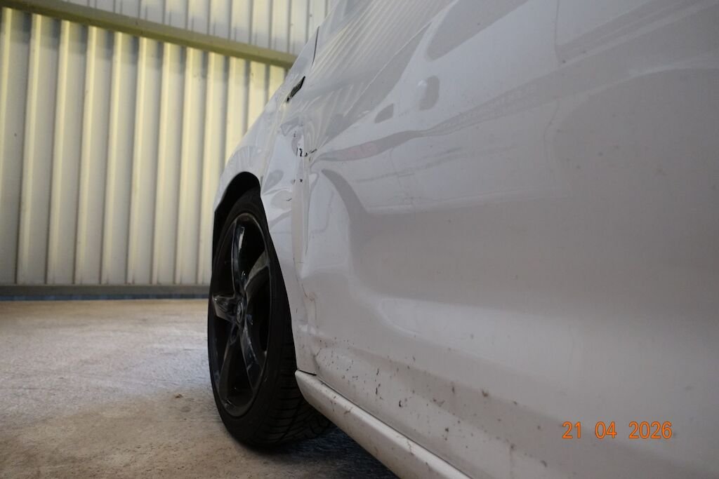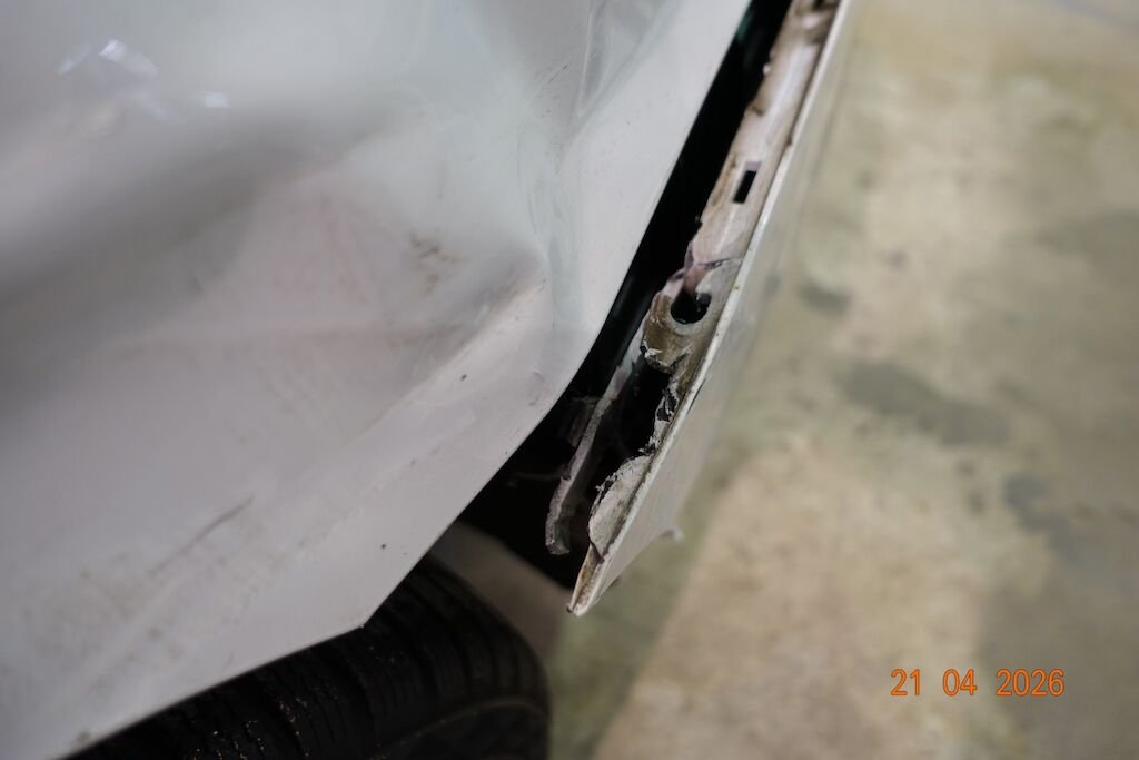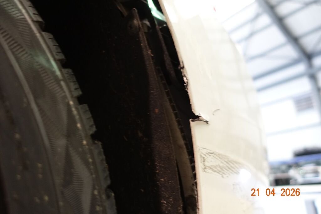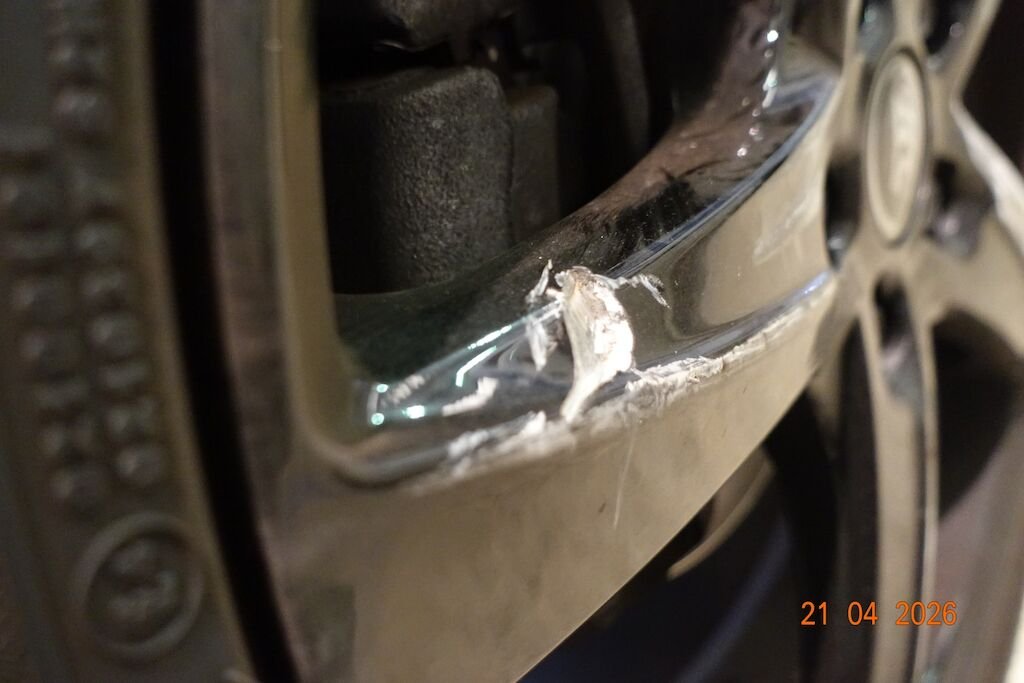 Die komplette linke Fahrzeugseite ist eingedrückt. Das Fahrwerk sowie die Felgen L sind ebenfalls beschädigt.