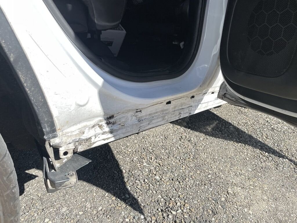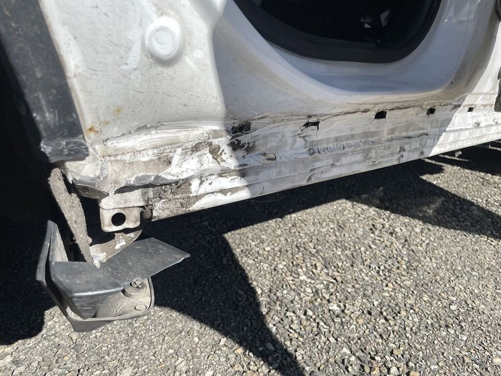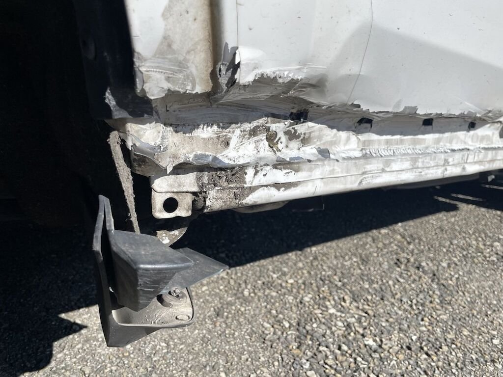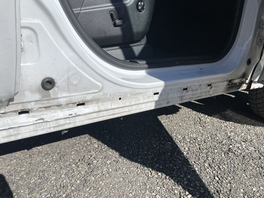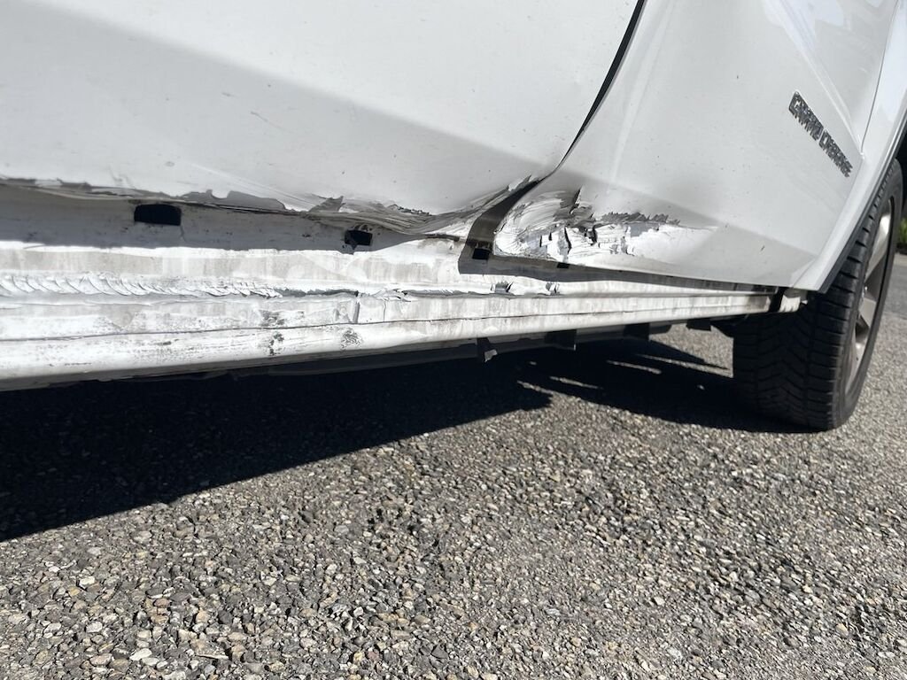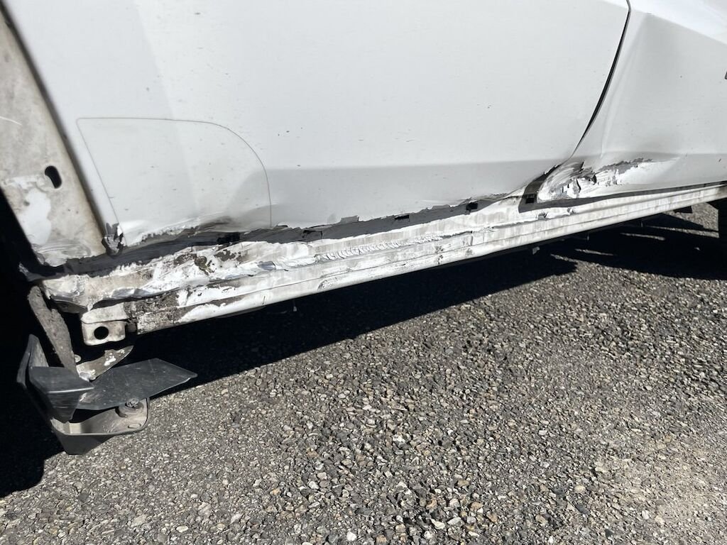 Collision du flanc droit: portes et bas de caisse endommagés. Divers autres éléments de carrosserie sont légèrement endommagés.