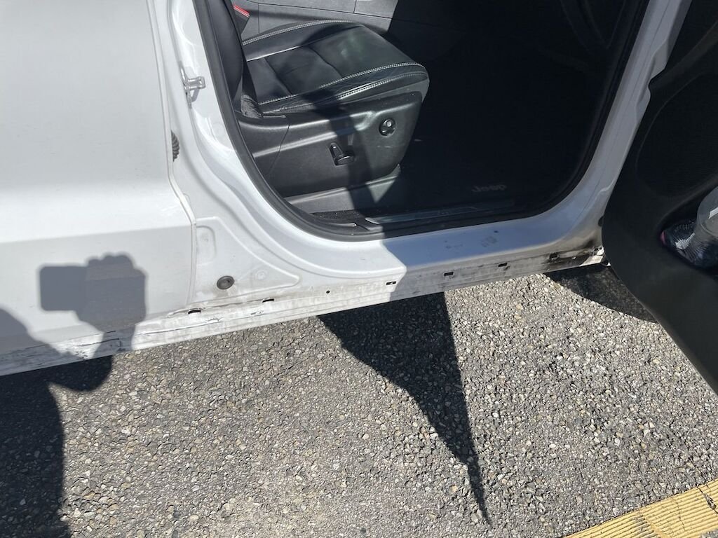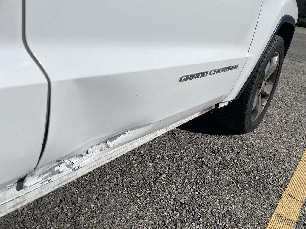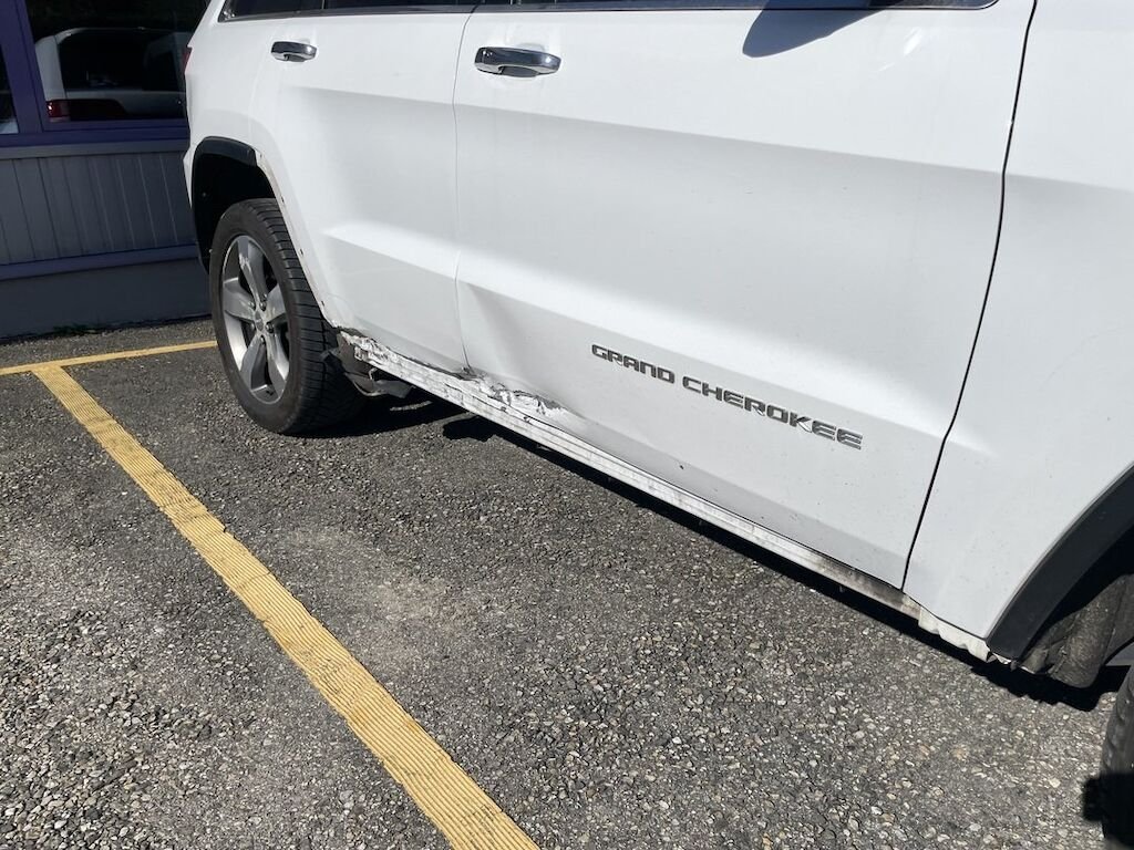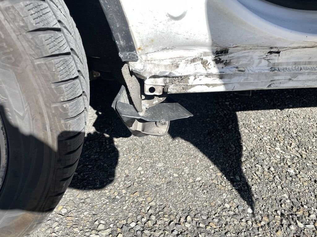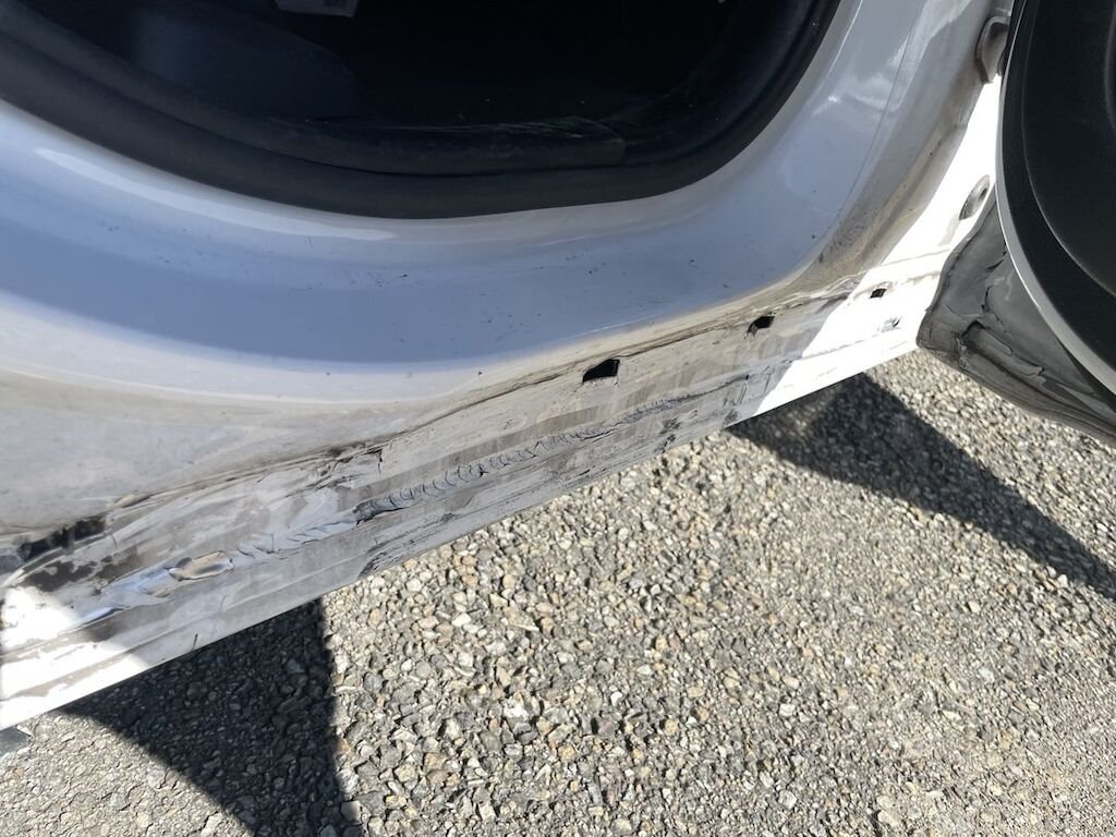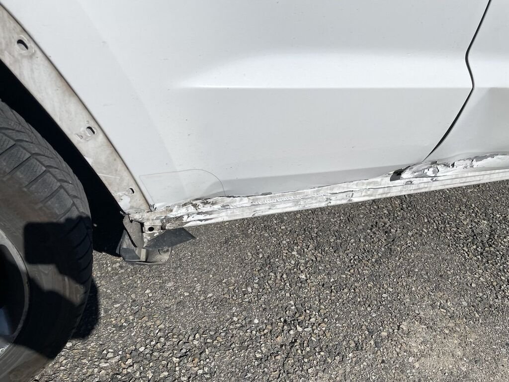 Collision du flanc droit: portes et bas de caisse endommagés. Divers autres éléments de carrosserie sont légèrement endommagés.