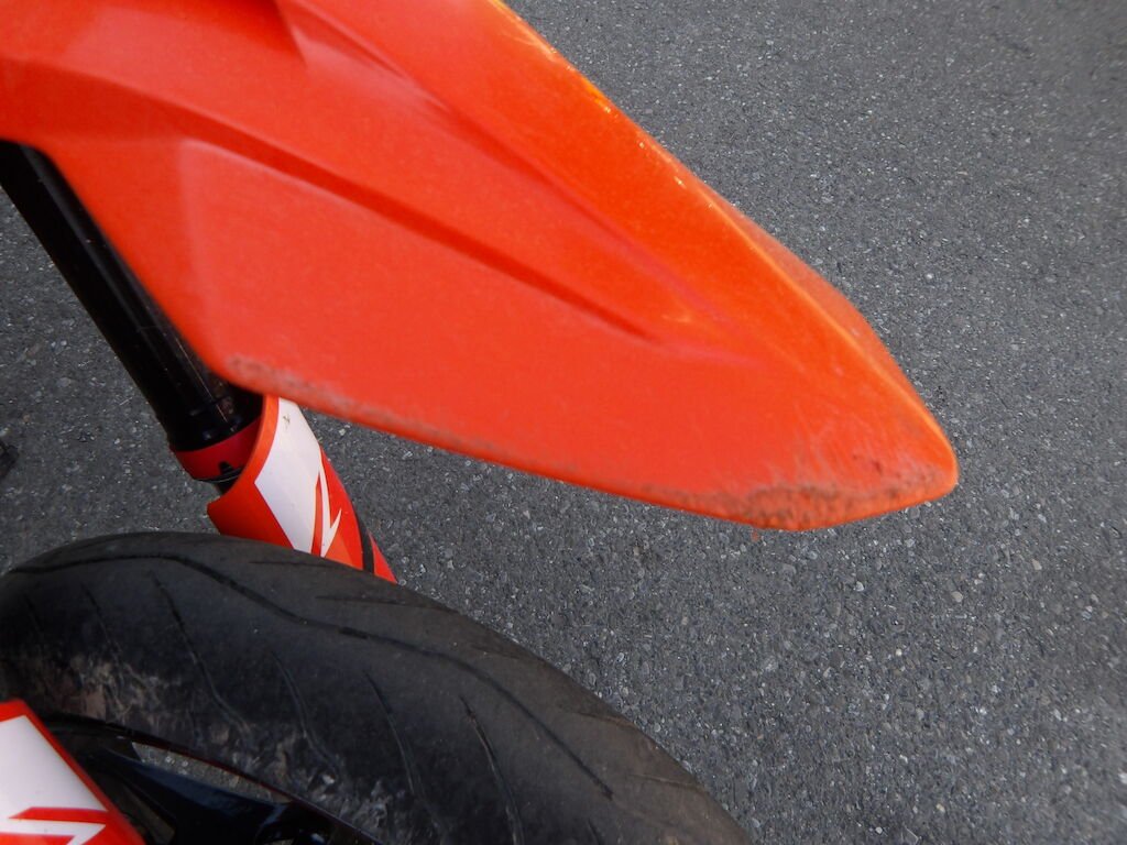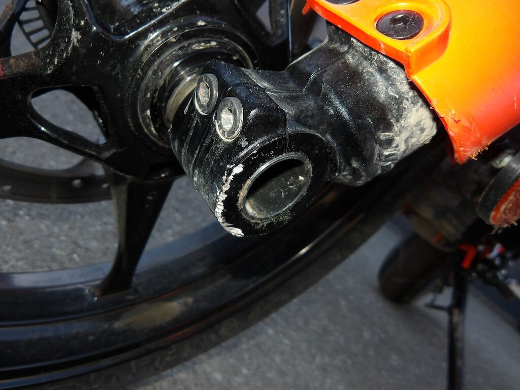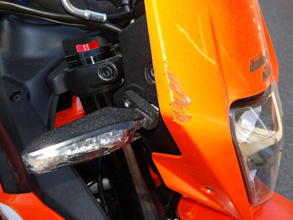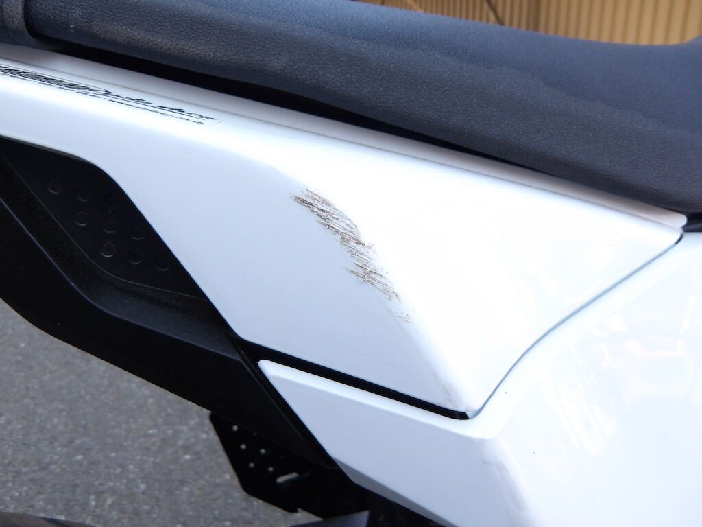 Flanc droit griffé = carénages avant et arrière griffés, guidon plié, embouts gauche et droit griffé, rétroviseurs gauche et droit cassés, support arrière passager griffé, clignoteurs cassé, spoiler avant et phare griffé, embout de fourche avant gauche griffé, pare-boue, béquille pliée, levier d'embrayage, de freins cassés, réservoir griffé (très léger).