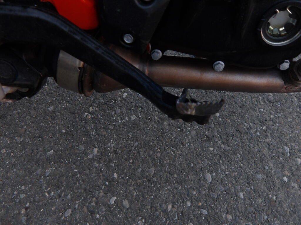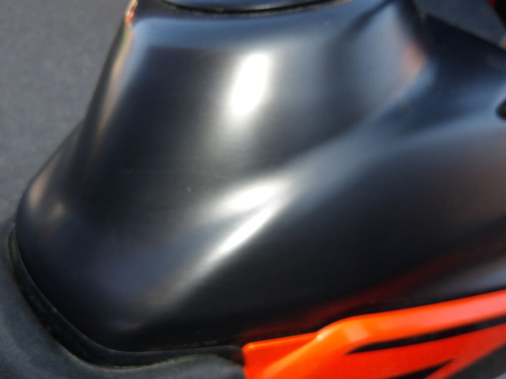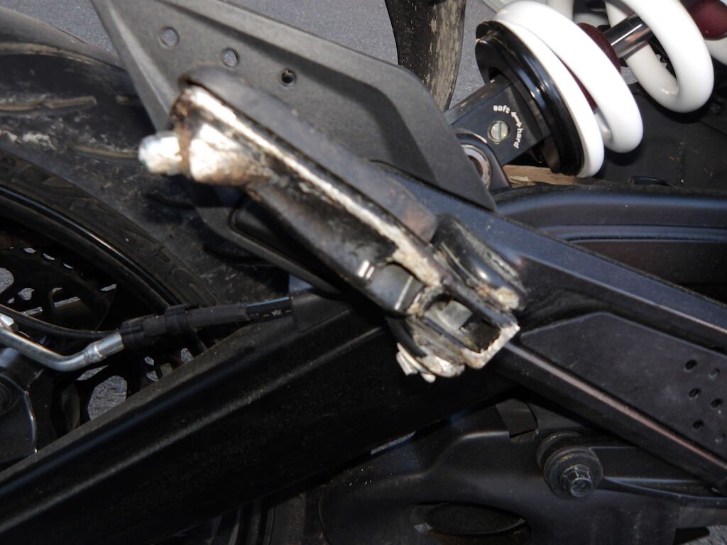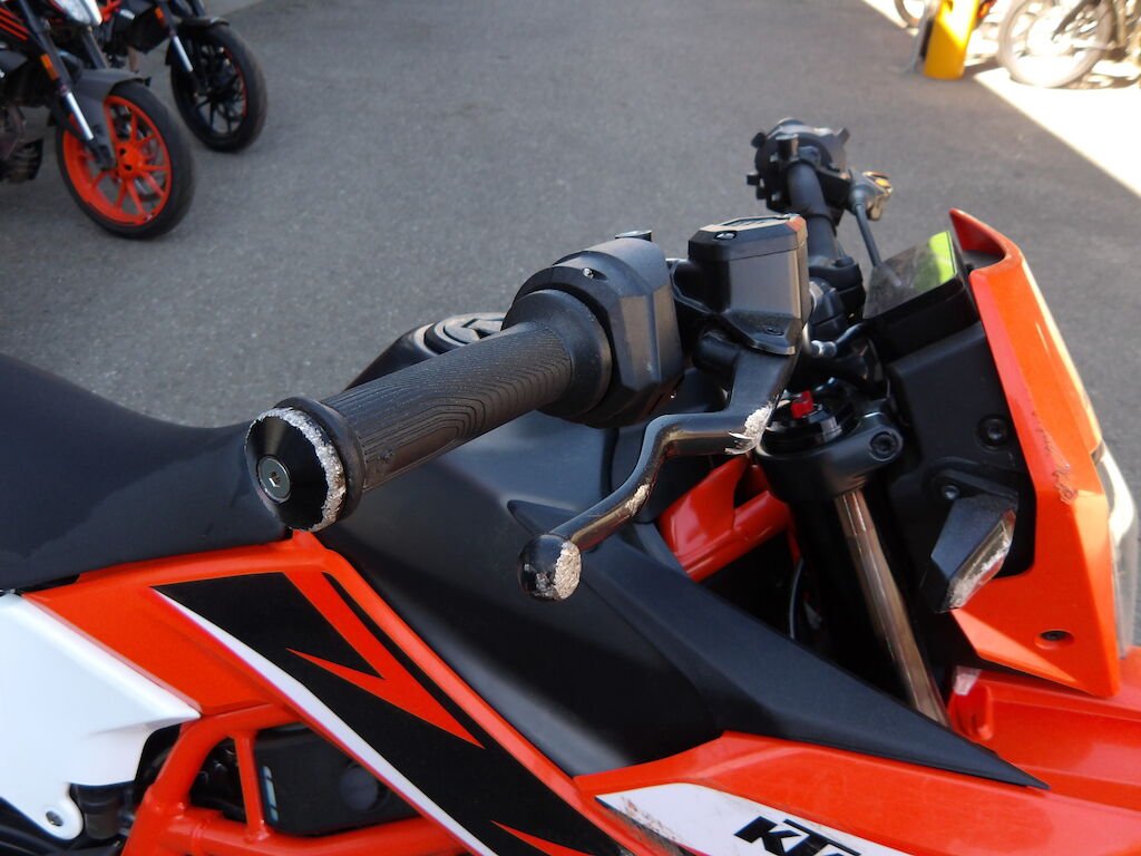 Flanc droit griffé = carénages avant et arrière griffés, guidon plié, embouts gauche et droit griffé, rétroviseurs gauche et droit cassés, support arrière passager griffé, clignoteurs cassé, spoiler avant et phare griffé, embout de fourche avant gauche griffé, pare-boue, béquille pliée, levier d'embrayage, de freins cassés, réservoir griffé (très léger).