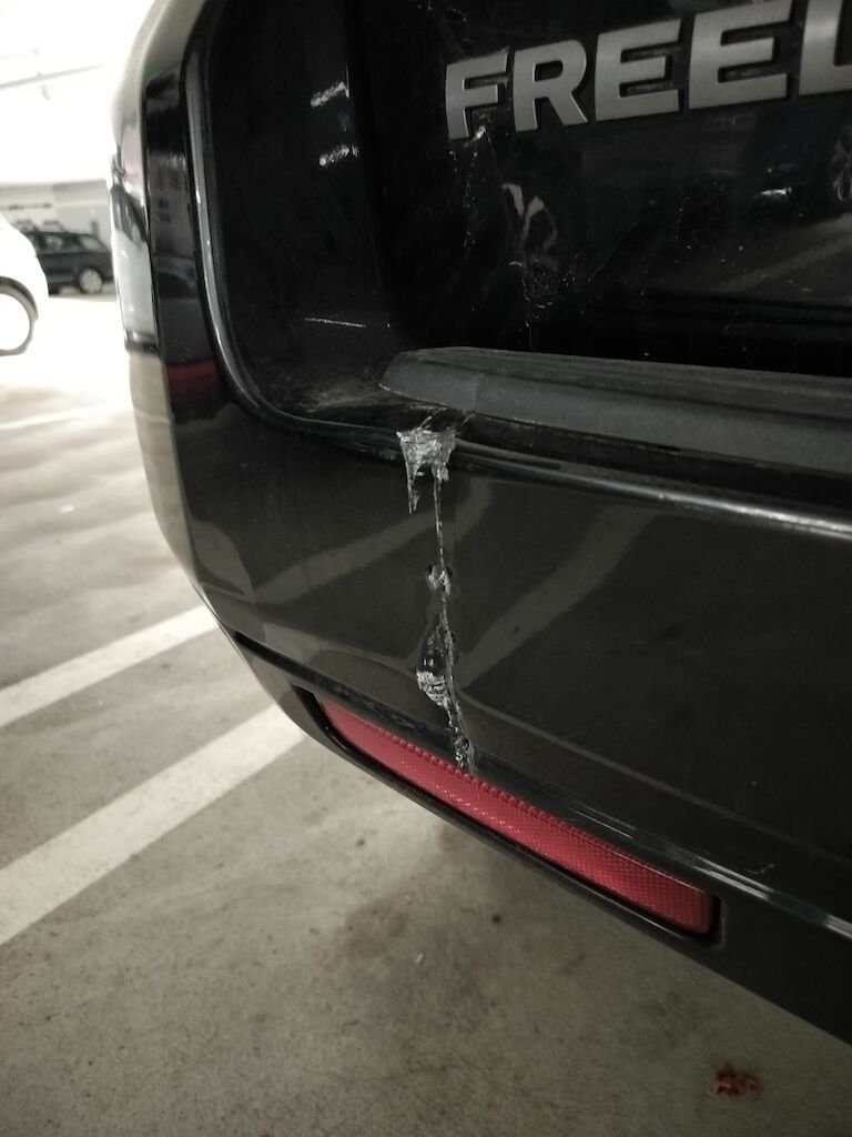 -Stossstange hinten links beschädigt. Siehe Foto hinten./ Diverse Kratzer am ganzen Frzg.