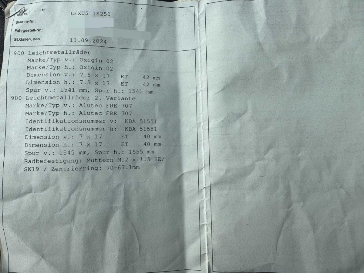 - Serial equipmentKlimatisierungsautomatik, Vordersitze elektrisch verstellbar mit Memory, inkl. Lenksäule und Aussen- spiegel, Automatische Umluftkontrolle, Höhenverstellbare Gurten vorne, Innenlicht-Abschaltverzögerung, Servolenkung geschwindigkeitsabhängig, Vordersitze heizbar und belüftet, Getönte Scheiben, Licht: Nebelschlussleuchte, ISOFIX Kindersitzvorrichtung, Bordcomputer, Elektrische Fensterheber vorne + hinten, Antiblockiersystem (ABS), Seitenfenster mit wasserabweisender Beschichtung, Airbag: Seitenairbag für Fahrer und Beifahrer, Zentralverriegelung mit Fernbedienung, Nebelscheinwerfer, Tankdeckel-Entriegelung von innen, Mittelarmlehne vorne, Digital Uhr, Katalysator geregelt, Stabilitäts- und Traktionskontrolle (VSC und TRC), Ausstiegsleuchten in den Türen, Aussenspiegel rechts und links beheizt, elektrisch verstell- / und einklappbar, Smart Key, Diebstahlwarnanlage, Gurtstraffer vorne, Airbag: Knie-Airbag für Fahrer und Beifahrer, Radio mit CD-Wechsler, Wegfahrsperre elektronisch, Elektrisch verstellbares Lenkrad, Regensensor, Licht: Drittes Bremslicht, 3 Kopfstützen hinten, Assist: Tempomat, Sonnenschutzrollo für Heckscheibe elektrisch, Info-Display, Räder: Notrad, Seitenairbags hinten, Tageskilometerzähler, Wassertemperaturanzeige, Lichtwarnsummer, Innen- und Aussenspiegel automatisch abblendend, 4 Leichtmetallfelgen 17J mit Pneu, Durchladeöffnung im Kofferraum, Mittelarmlehne hinten, Pollenfilter (Staubfilter), Airbag: Window-Kopfairbags, Scheibenwischer vorne mit Intervall, Bi-Xenon-Scheinwerfer mit aktivem Kurvenlicht und Scheinwerfer- Reinigungsanlage, Bremsassistent (BAS), Heckscheibenheizung, Aussentemperaturanzeige, Kofferraum-Entriegelung von innen, Polster: Leder-Ausstattung, Einstiegsschienen beleuchtet, Radiovorbereitung, Antenne, Entstörung und 13 LS, Airbag: Airbag Fahrer und Beifahrer, Aktivkohlefilter (Geruchsfilter), Multifunktionslenkrad in Leder, Holzapplikationen, Park Distance Control vorne und hinten, 6-Gang-Getriebe