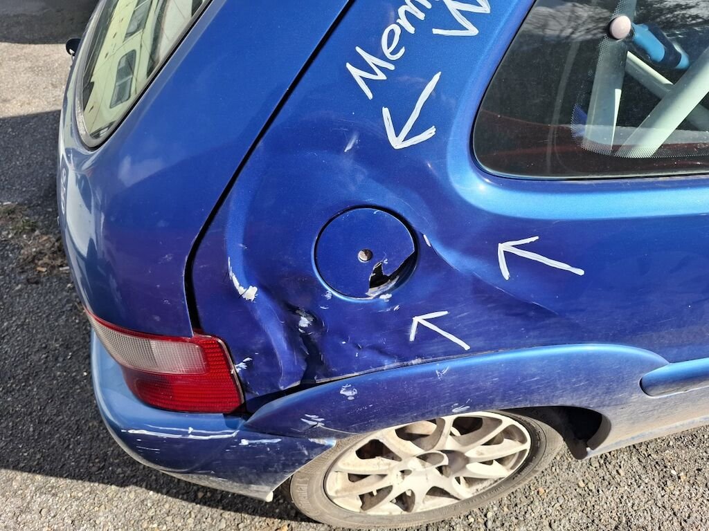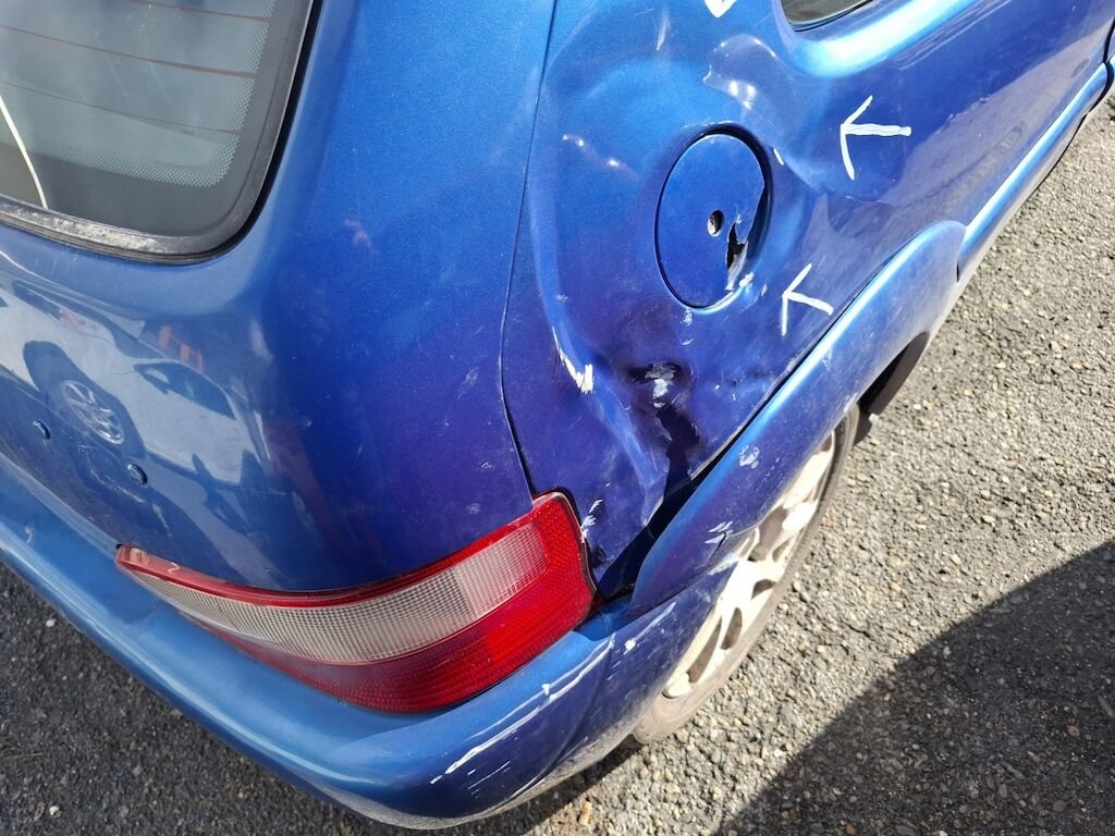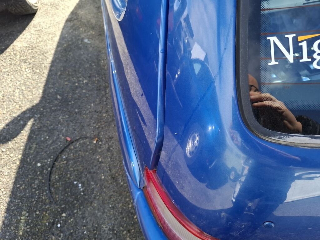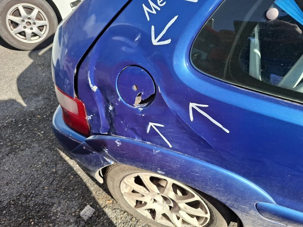 Dommage arrière droit:panneau latéral fortement plié déformé embouti enfoncé endommagé, bloc arrière coque déformés décentré endommagés, feu portillon d'essence angle d'enveloppe de pare chocs élargisseur d'aile cassés fissurés éclatés arrachés endommagés.