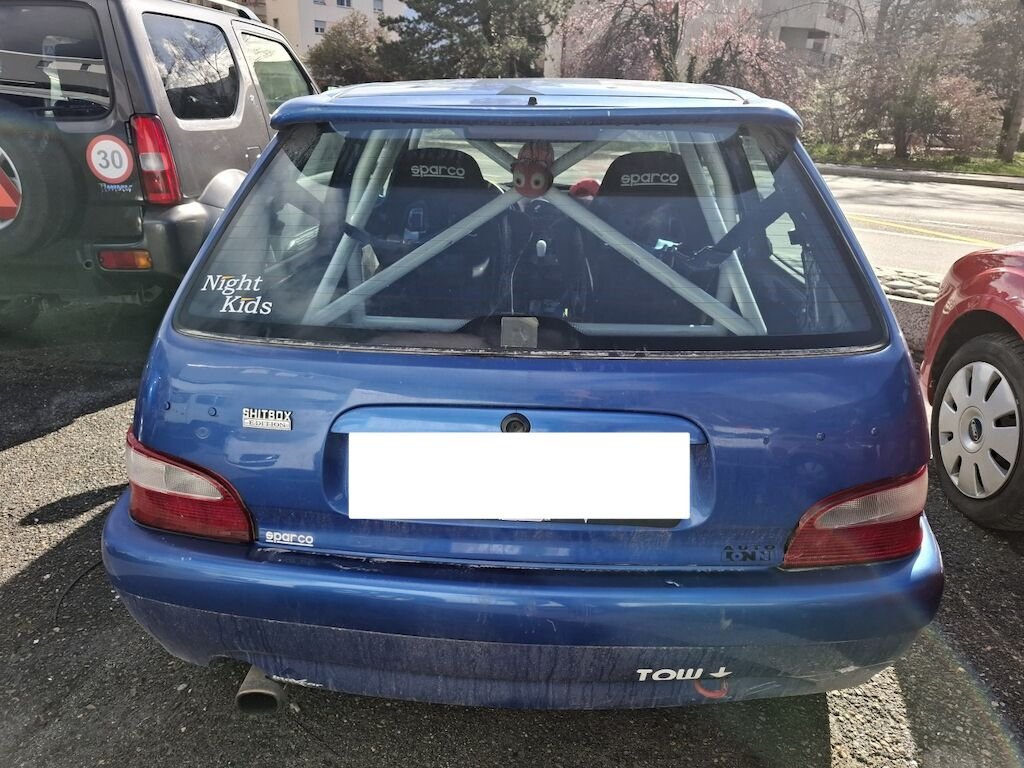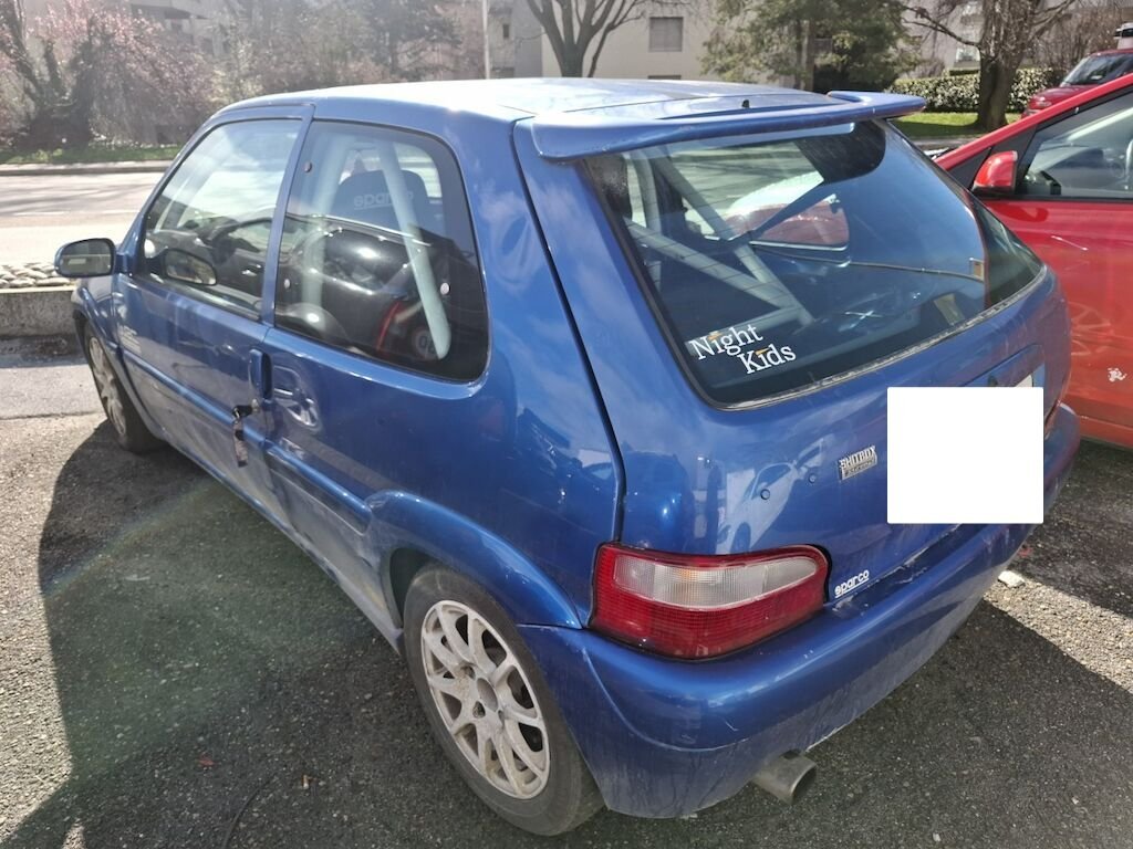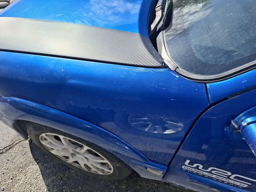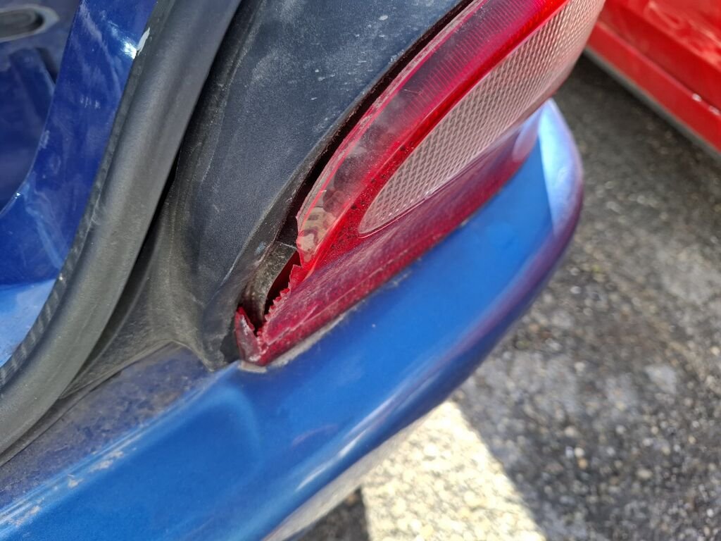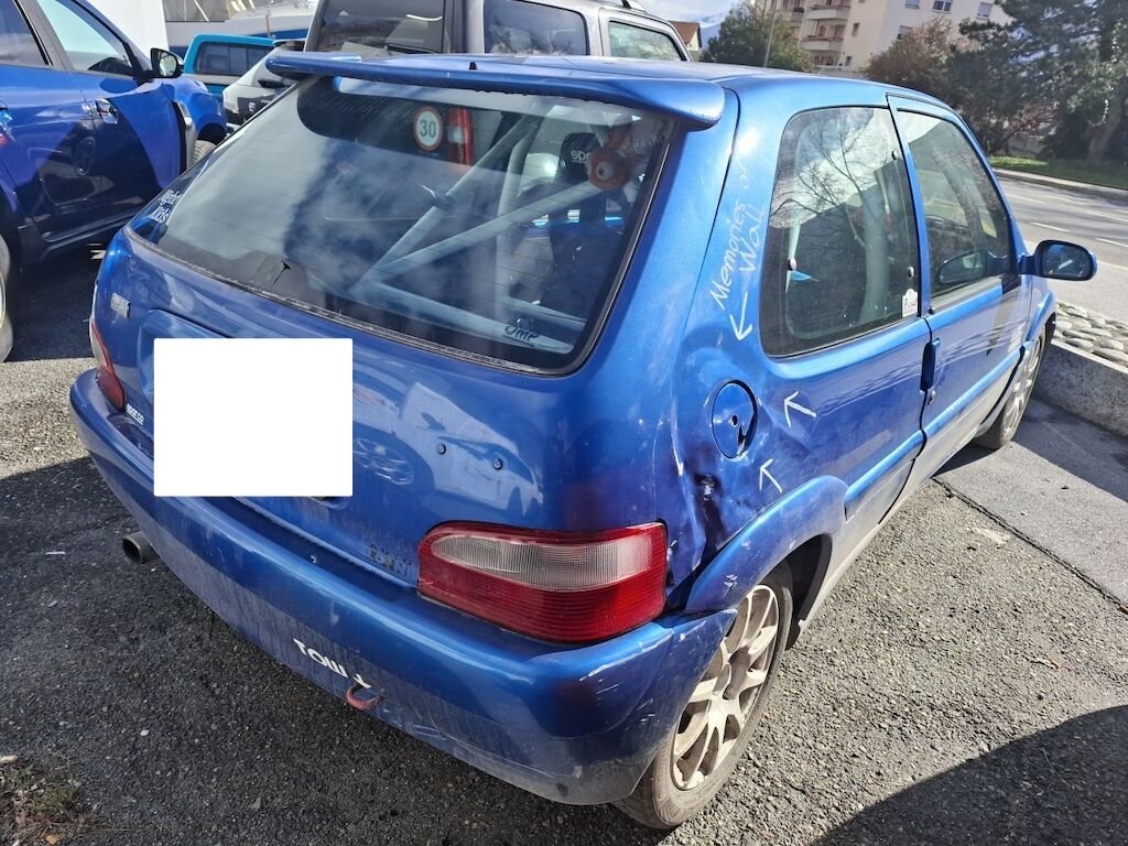 Dommage arrière droit:panneau latéral fortement plié déformé embouti enfoncé endommagé, bloc arrière coque déformés décentré endommagés, feu portillon d'essence angle d'enveloppe de pare chocs élargisseur d'aile cassés fissurés éclatés arrachés endommagés.
