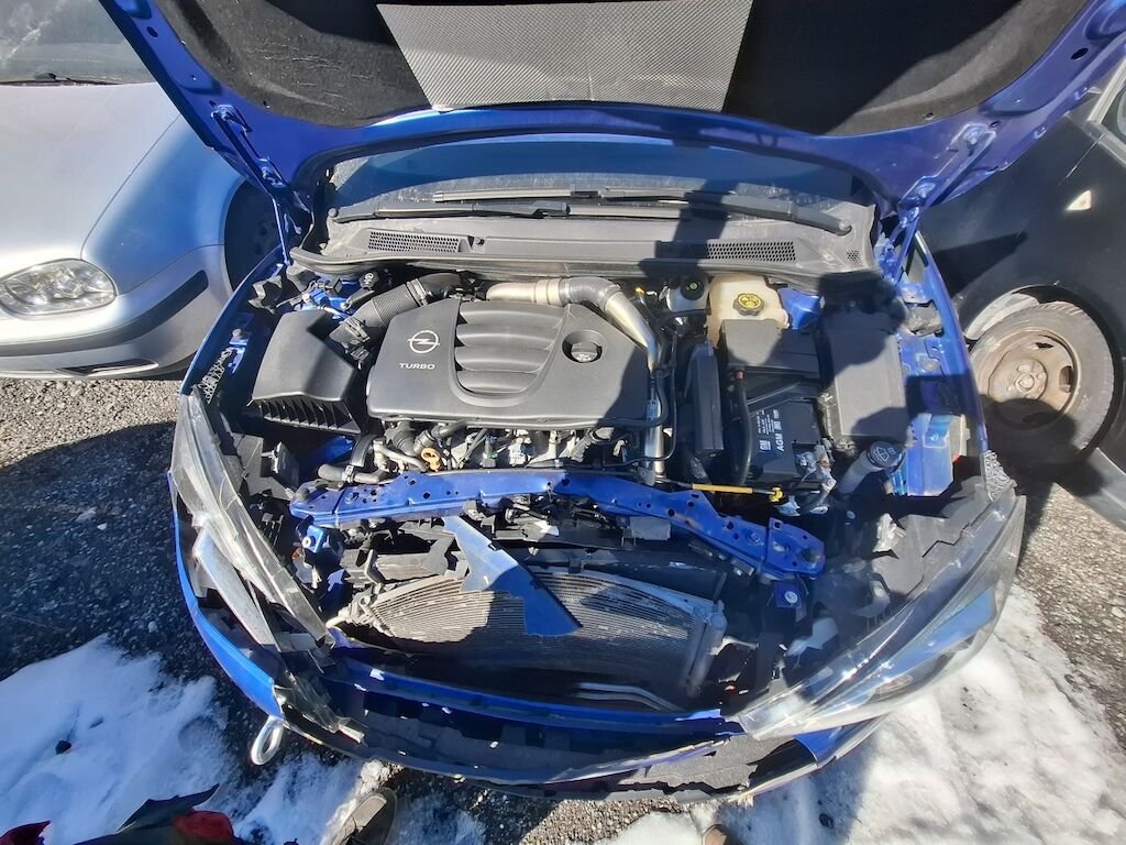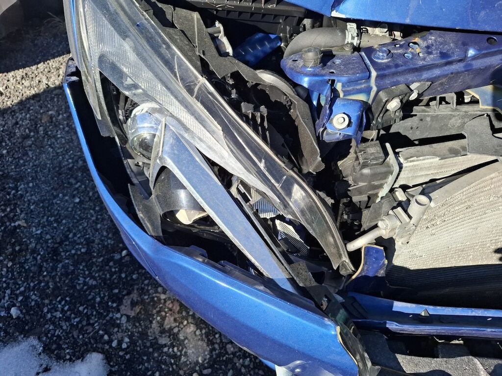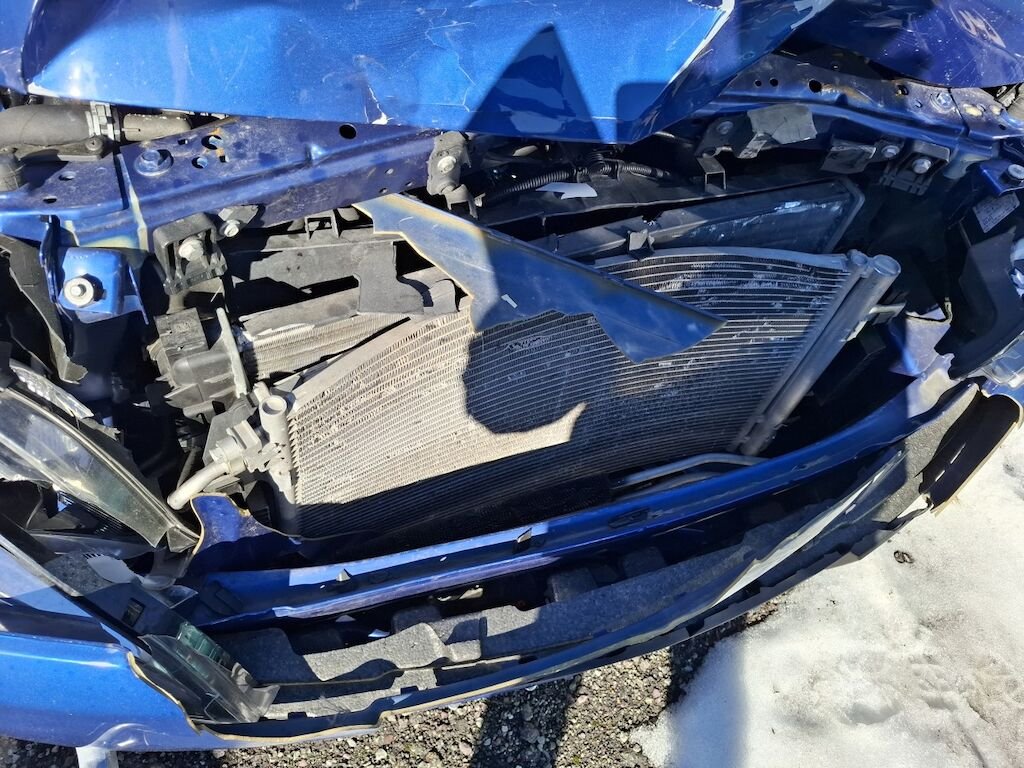 Dommage partie frontale: bloc avant fortement plié déformé embouti enfoncé disloqué endommagé, capot charnières et serrure de capot moteur aile droite tôle frontale renfort de pare chocs fortement pliés déformés emboutis enfoncés endommagés, phares gauche et droit enveloppe supports garniture et grilles de pare chocs calandre convoyeurs d'air et ventilateur de refroidissement cassés fissurés éclatés arrachés endommagés, condenseur de climatisation intercooler radiateur de refroidissement percés déformés endommagés.