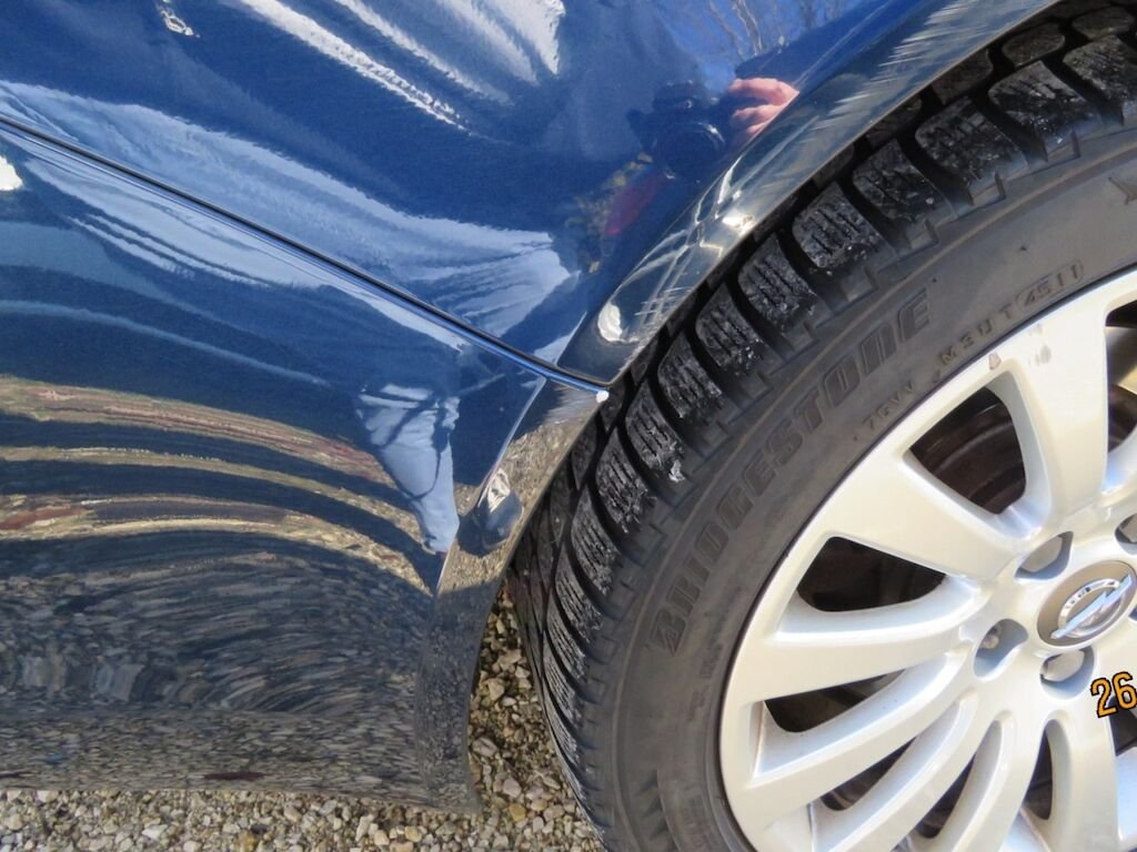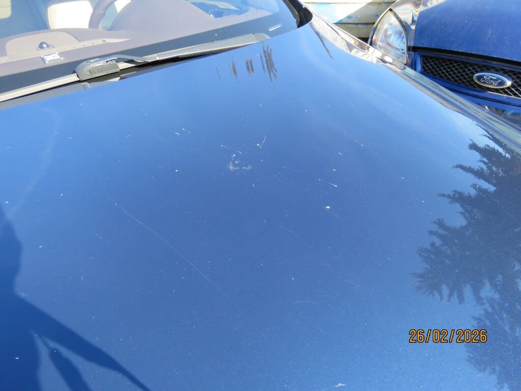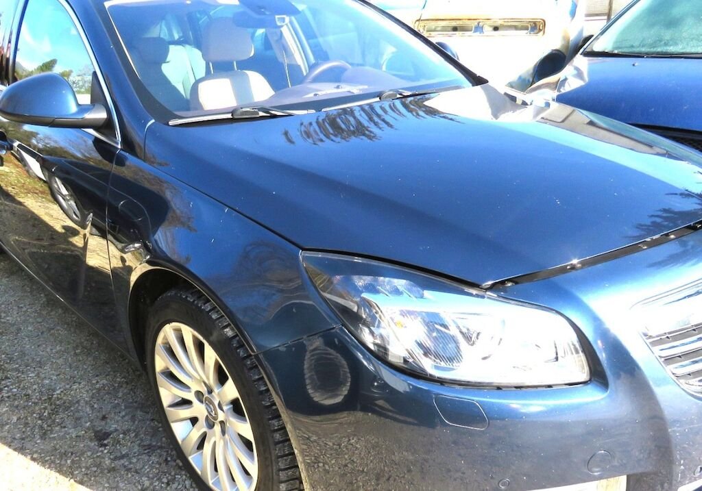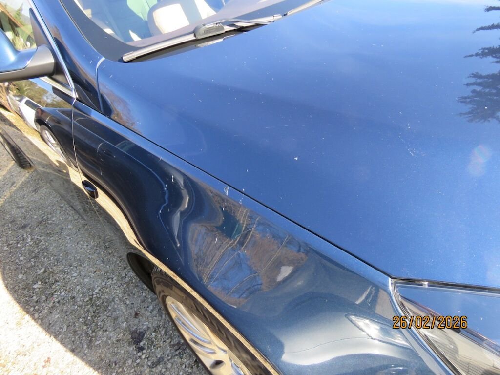 -Lackschäden sichtbar am vorderen Stossfänger, Motorhaube, Kotflügel links und rechts, A-Säule rechts, Rückspiegel rechts, Dachrahmen rechts