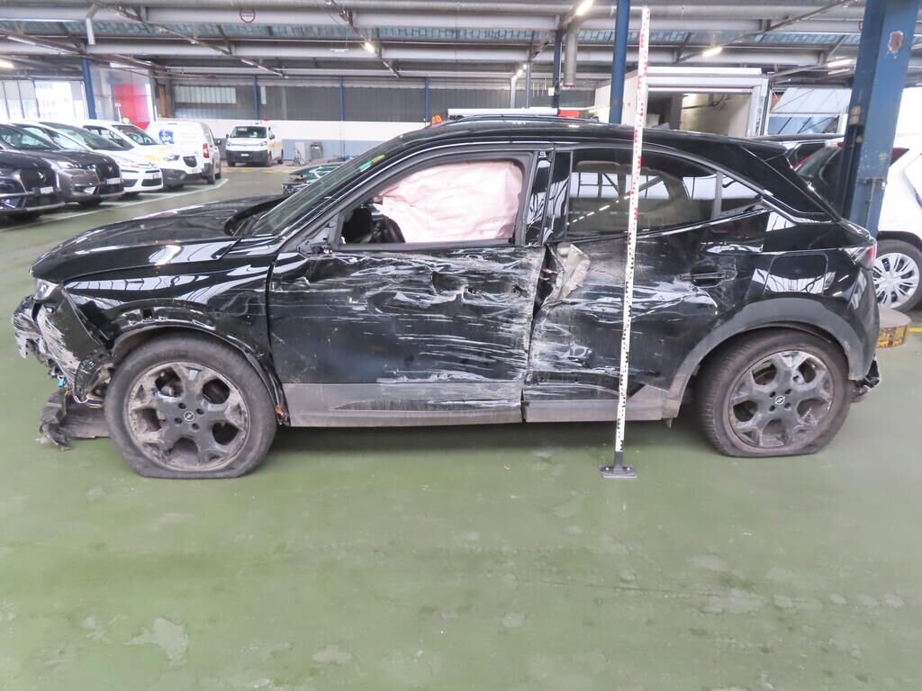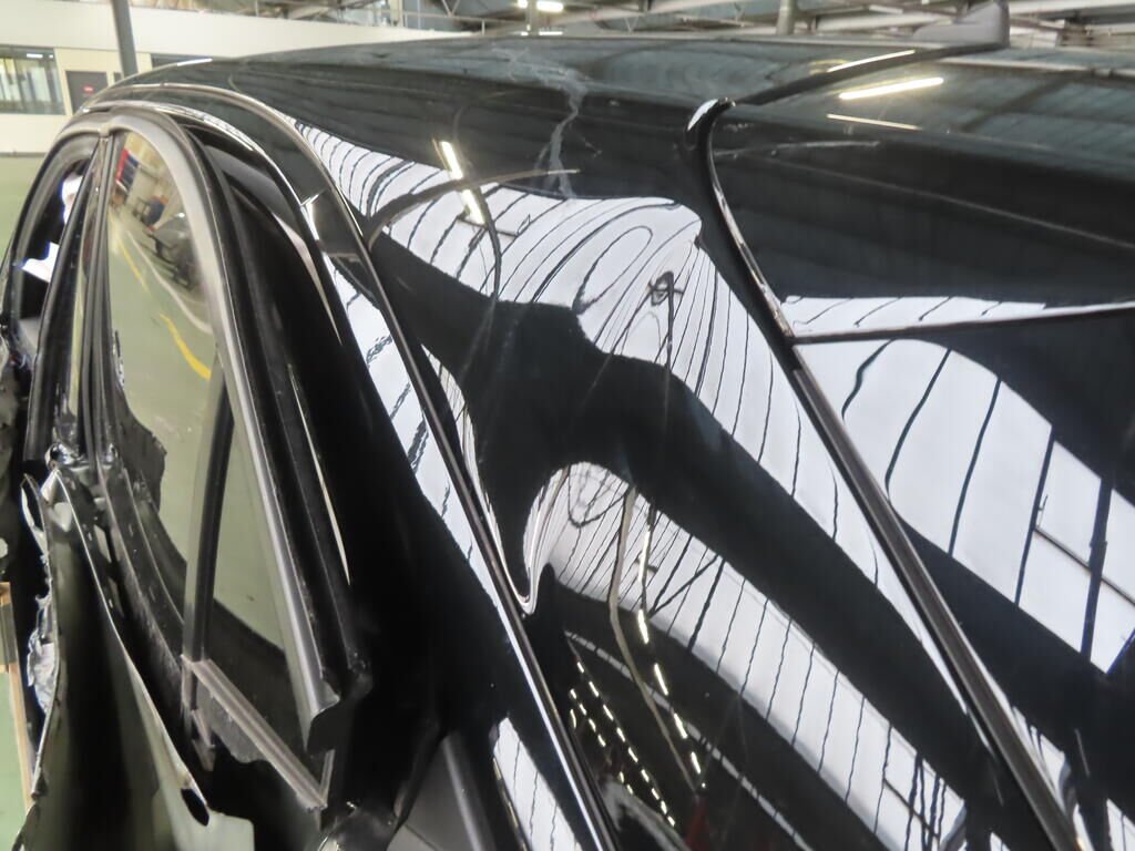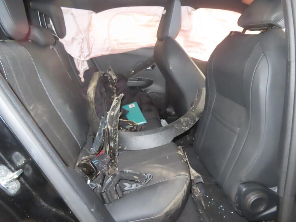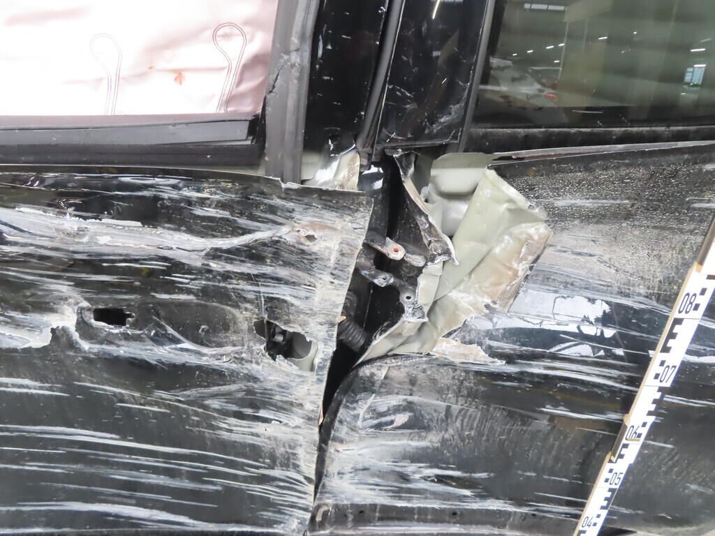 Avant, latéral gauche, suspension, roue, tôle arrière, montant B, toit, hayon, pare-chocs arrière, latéral droit; enfoncés et pliés.