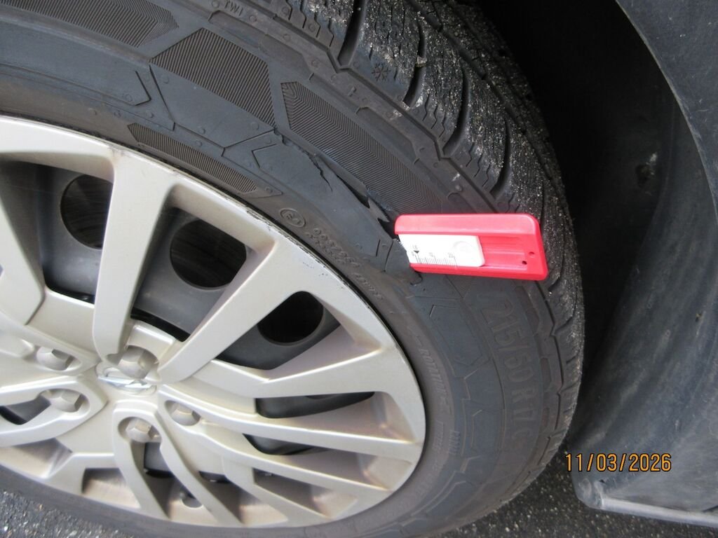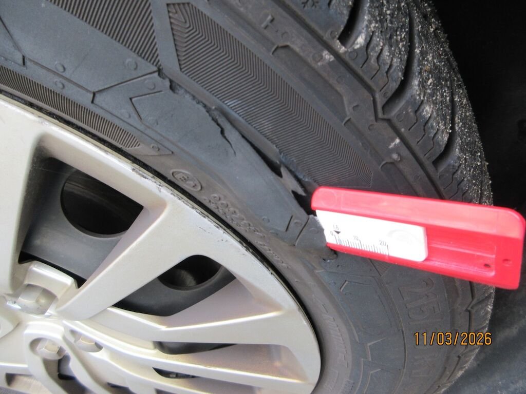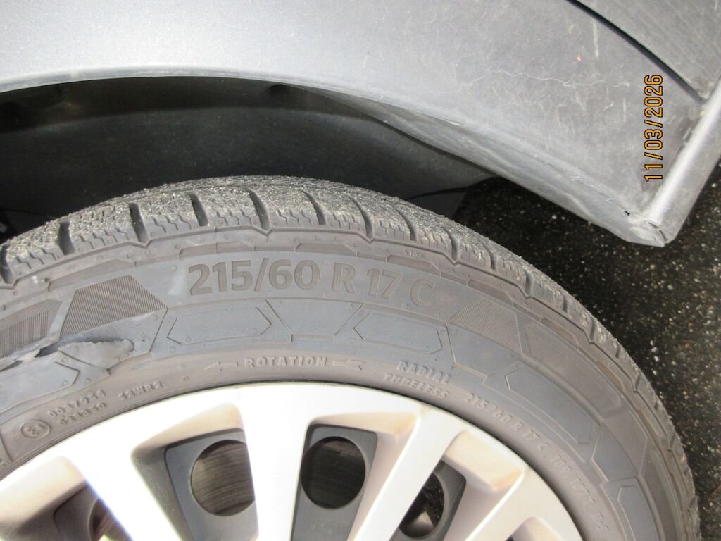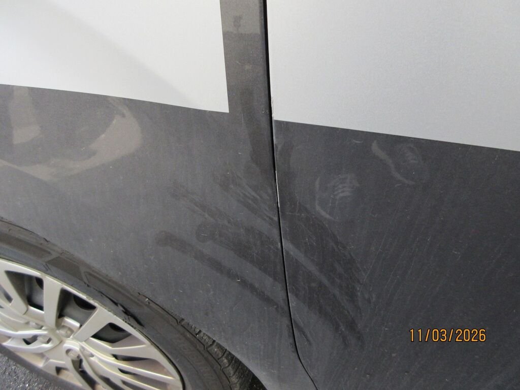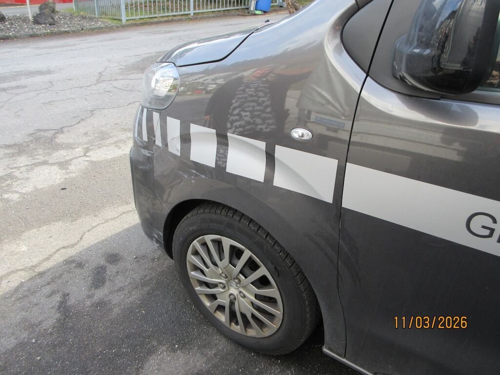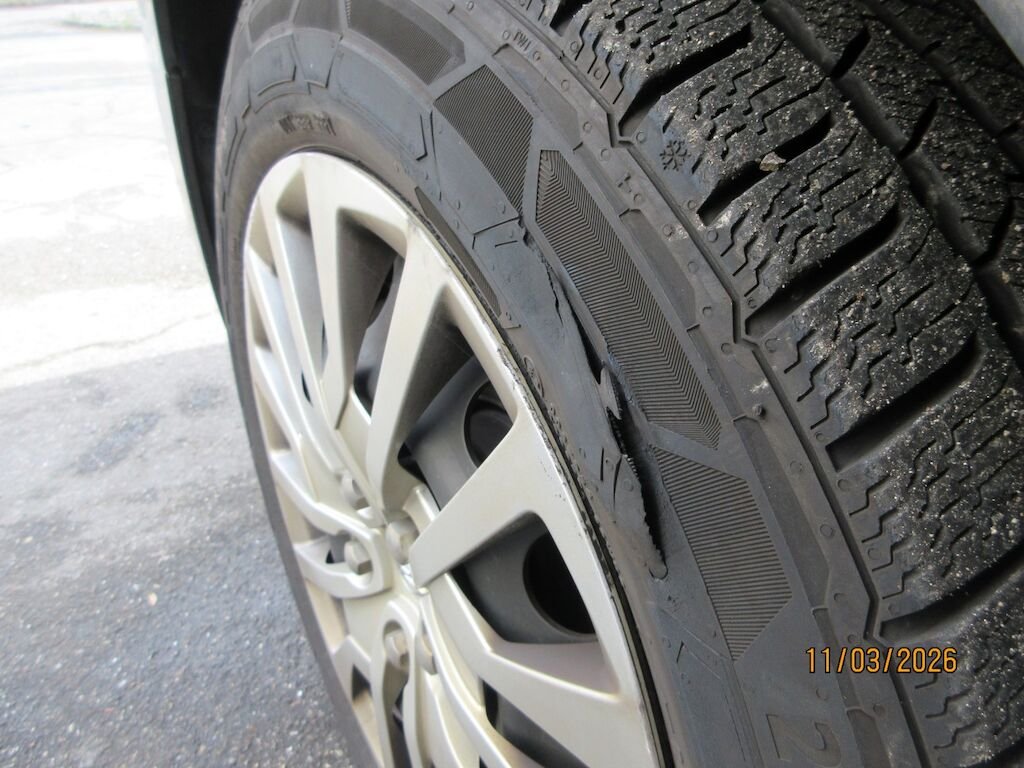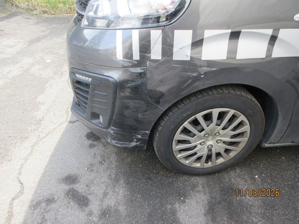 Stossfängerabdeckung Oberteil und Unterteil gerissen und deformiert. Kotflügel eingebeult. Der Reifen vorne links ist aufgeschlitzt.