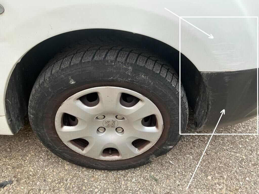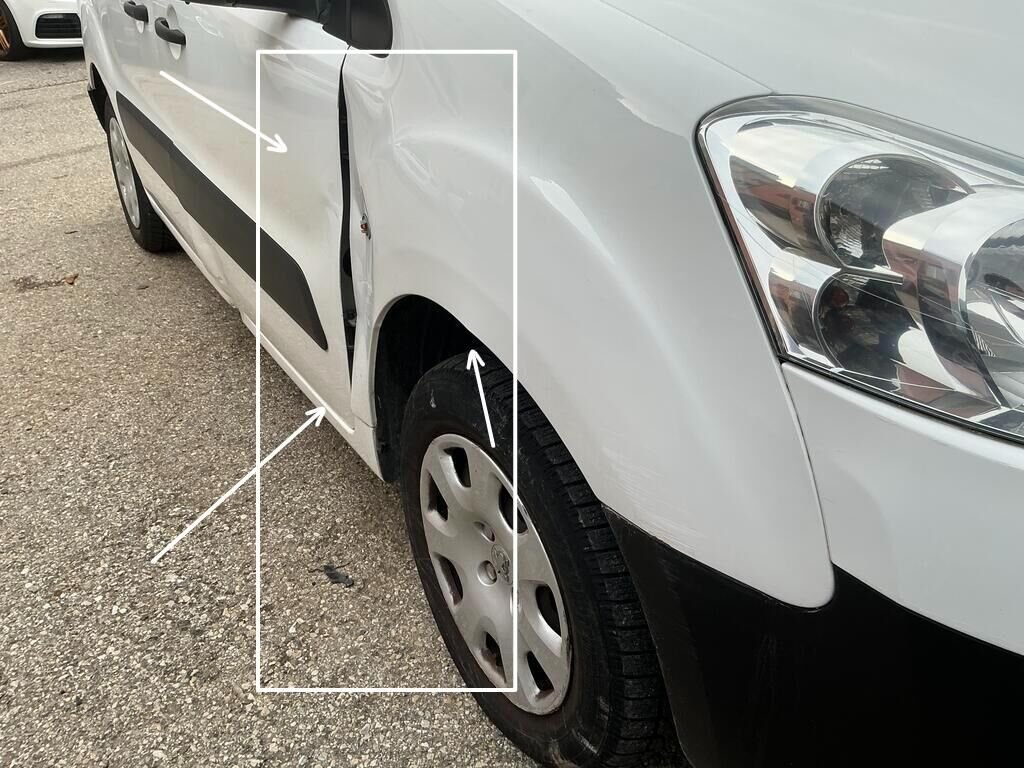 Pare-chocs avant, aile avant droit, jante avant droit, train avant droit, porte avant droit et bas de caisse droit endommagés.