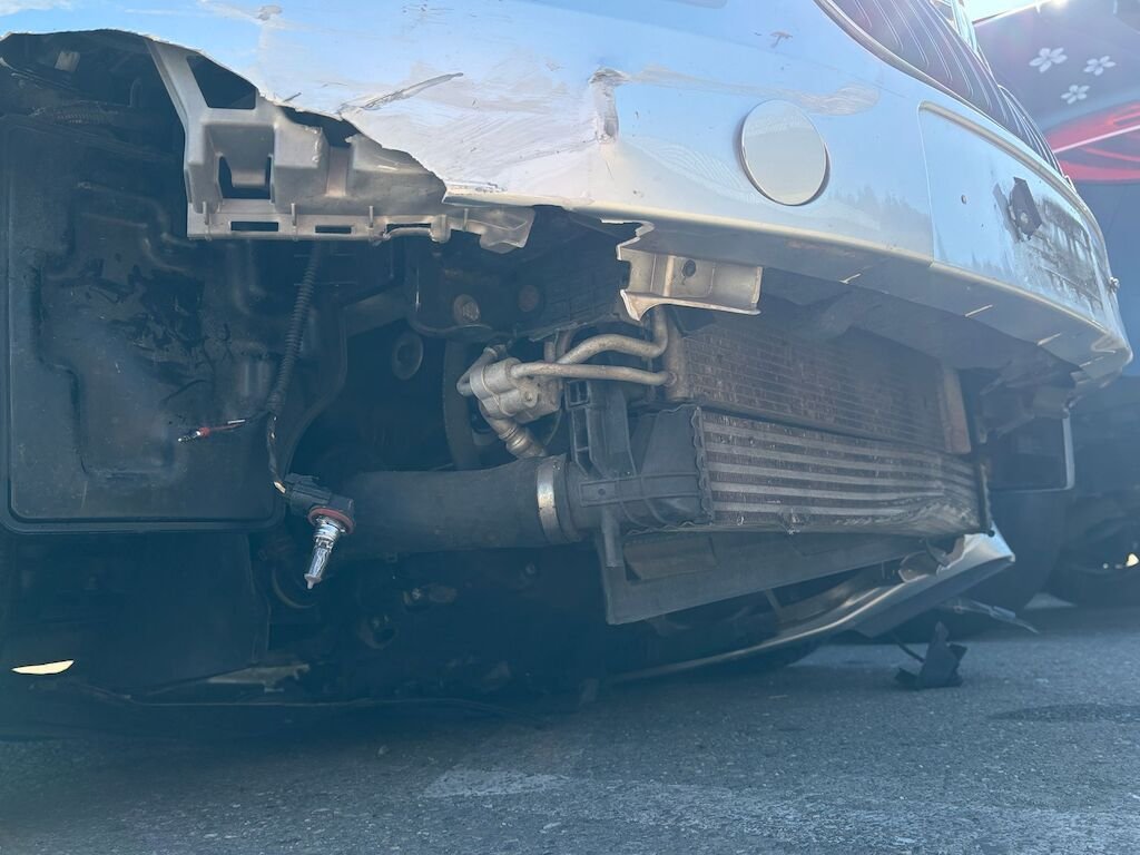 Kollisionsschaden Front, mit Beschädigung der Stossstange, der Motorhaube, der Scheinwerfer, der Frontmaske, der Kühler, der Kotflügel, sowie Teile des Unterbodens etc.