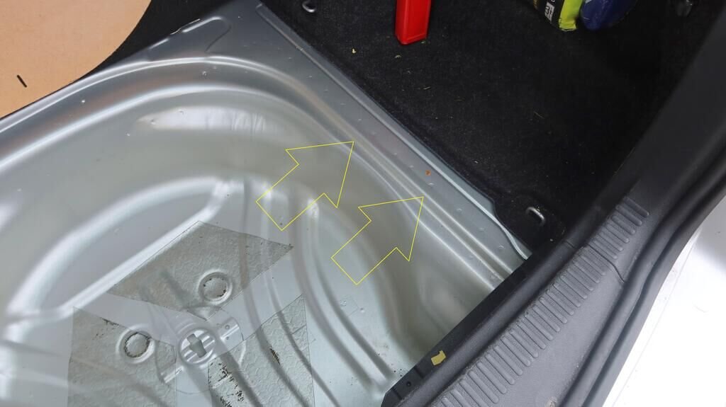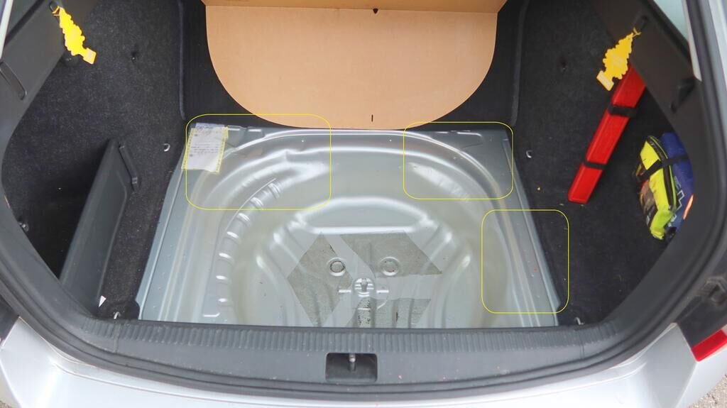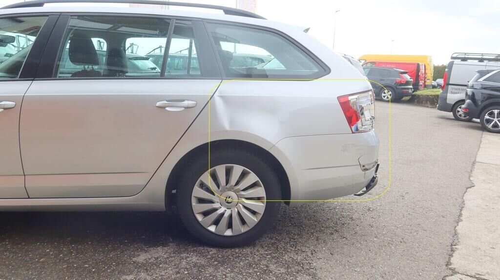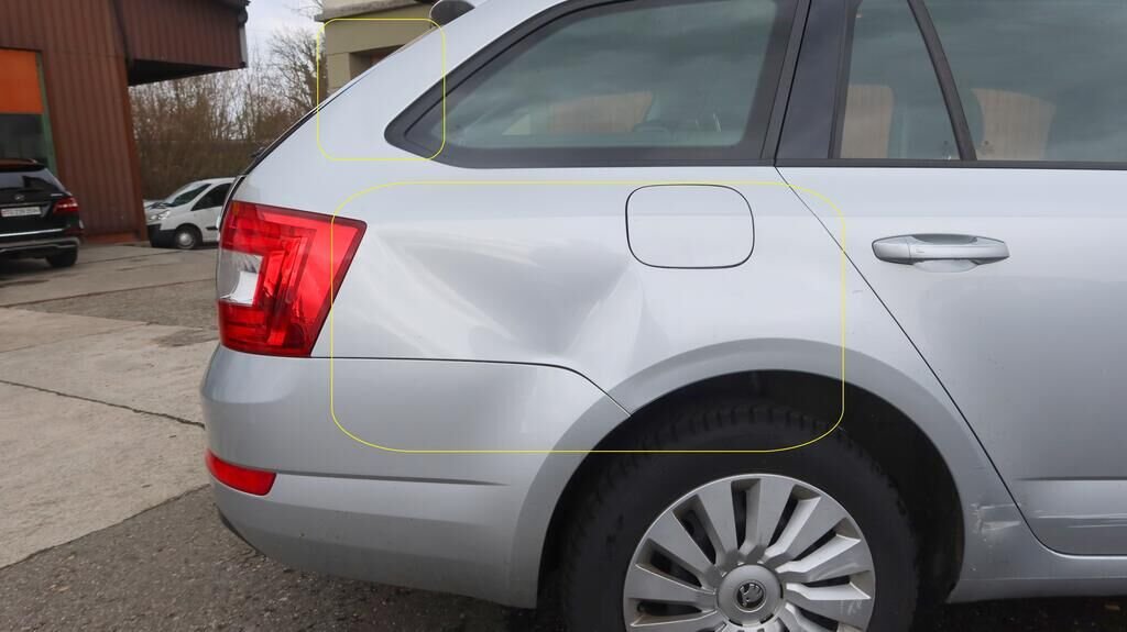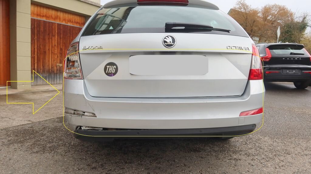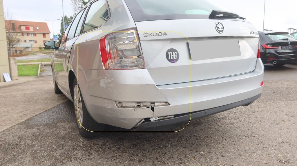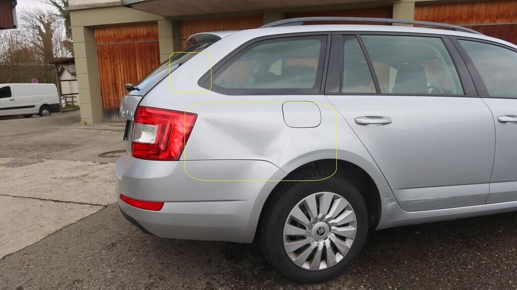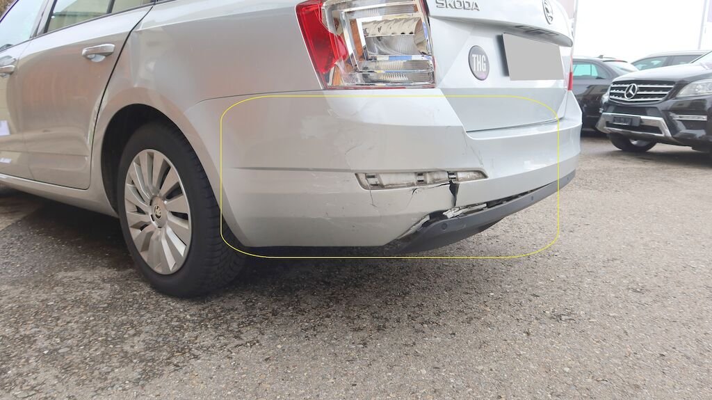 Längsträger links und rechts deformiert, Seitenwand hinten links und rechts verformt, Kofferraumboden hinten deformiert, Heckklappe verzogen, Heckblech gestaucht nach rechts, Stossstangenabdeckung hinten gerissen, Spoiler hinten unten gerissen, Heckleuchte links gebrochen.