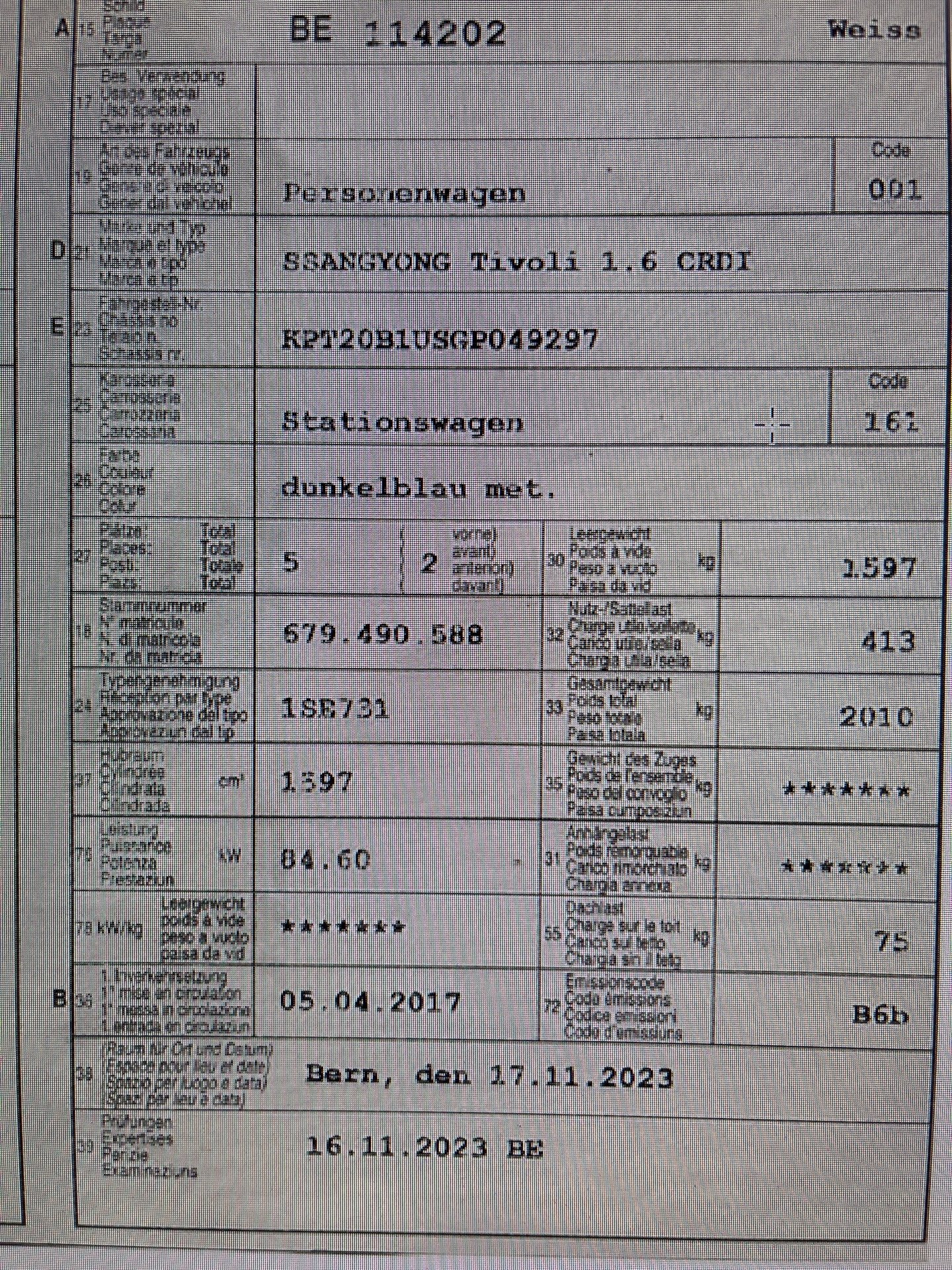2017 SSANGYONG Tivoli 1.6 CRDI