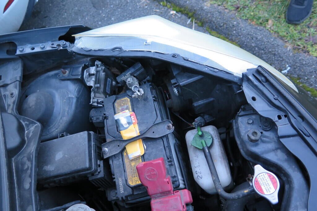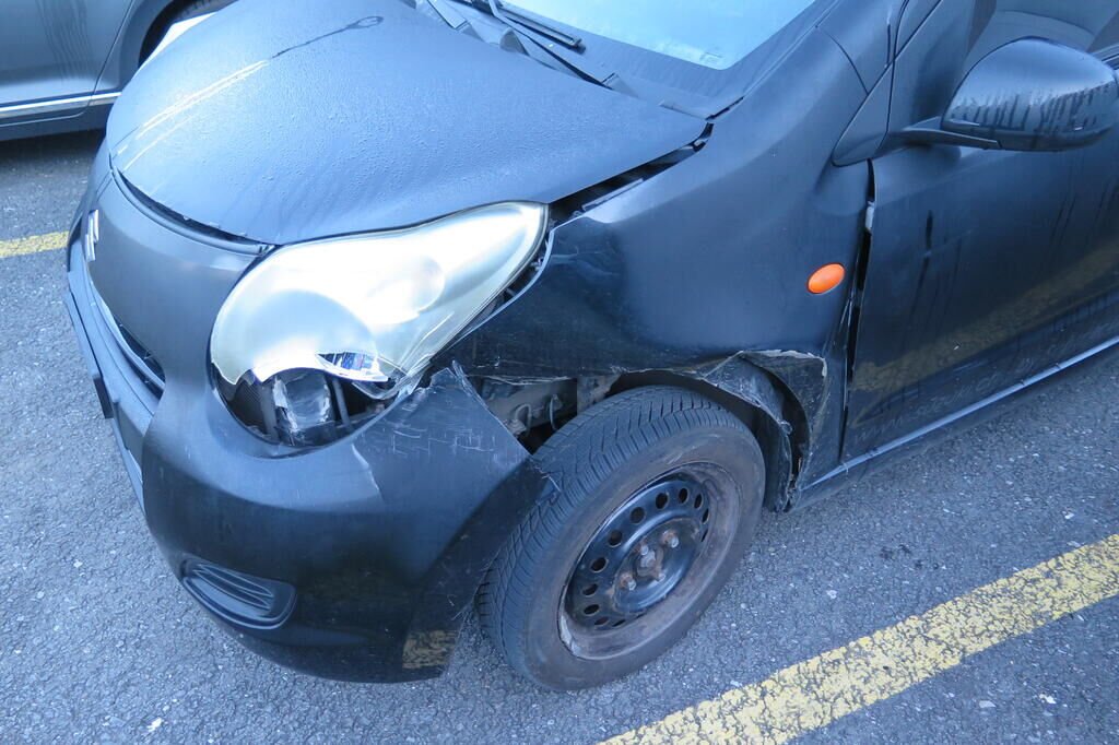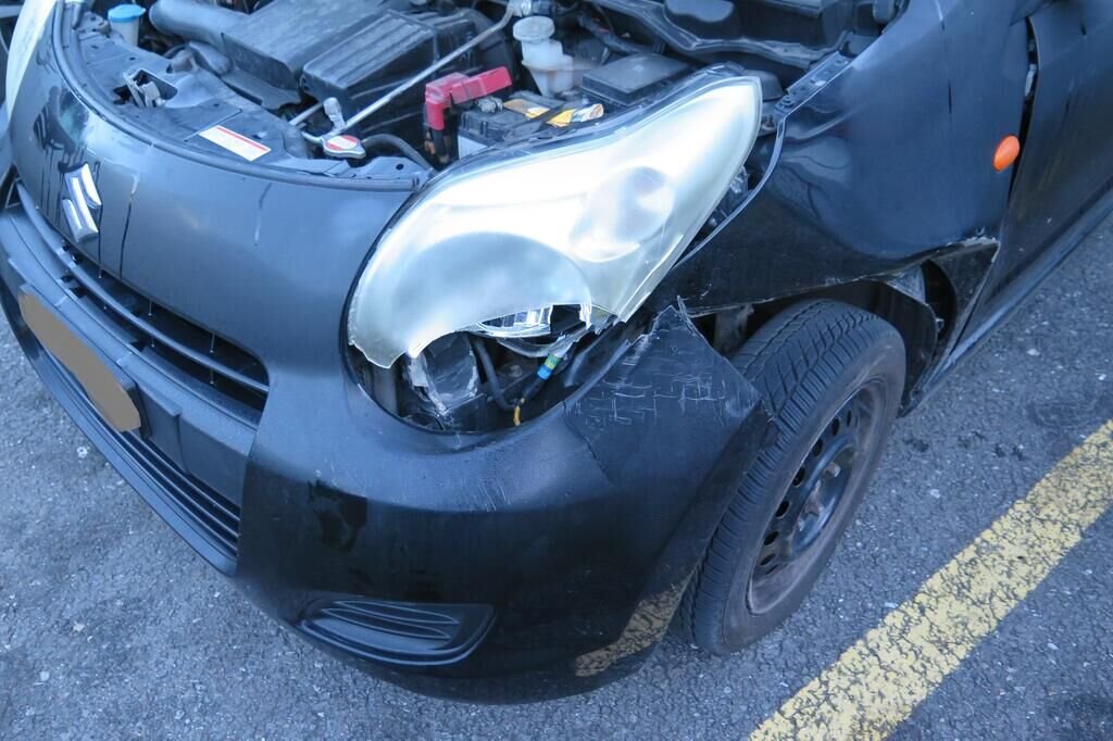 Pare-chocs avant enfoncé et cassé, aile avant gauche enfoncée, phare cassé, armatures intérieures refoulées, risque train avant faussé.
