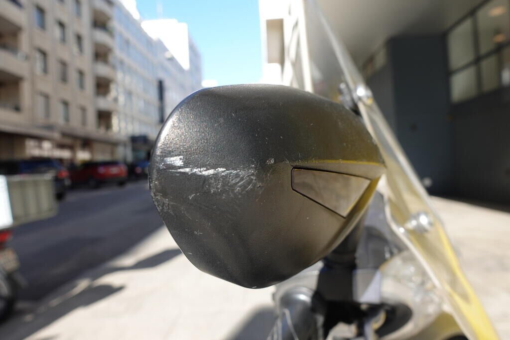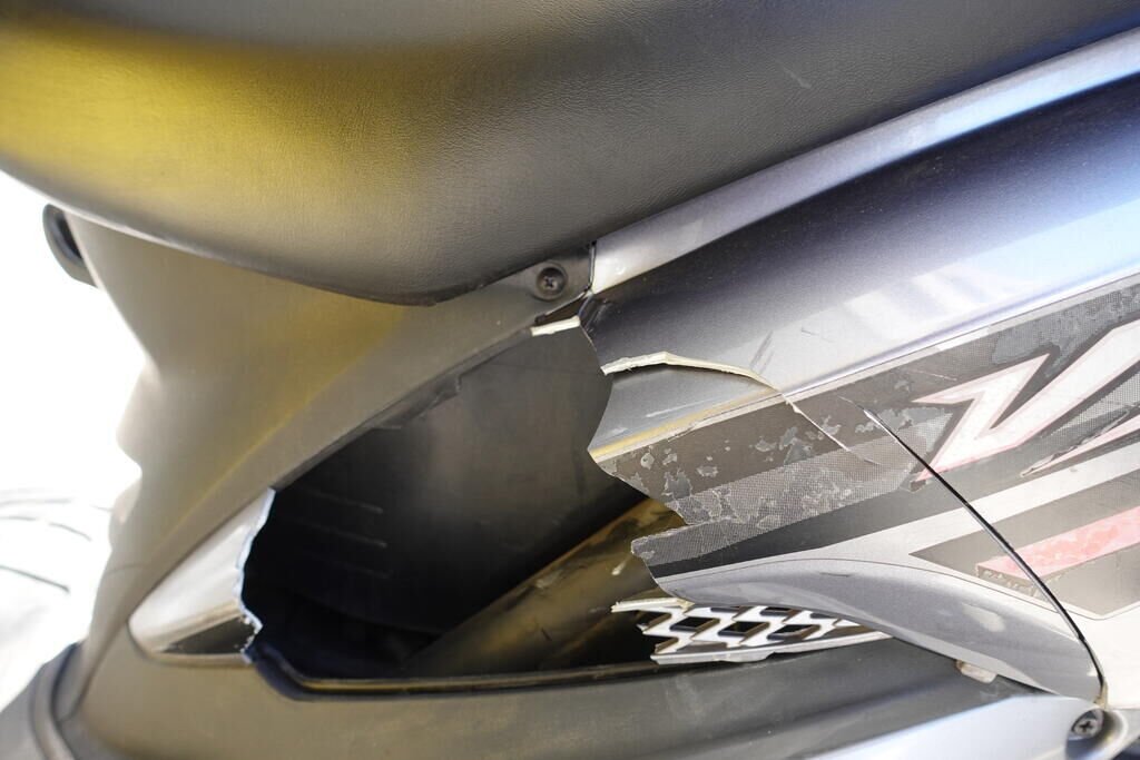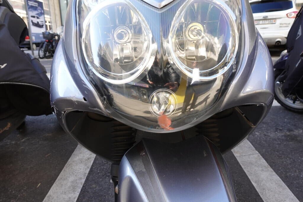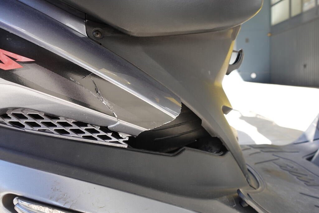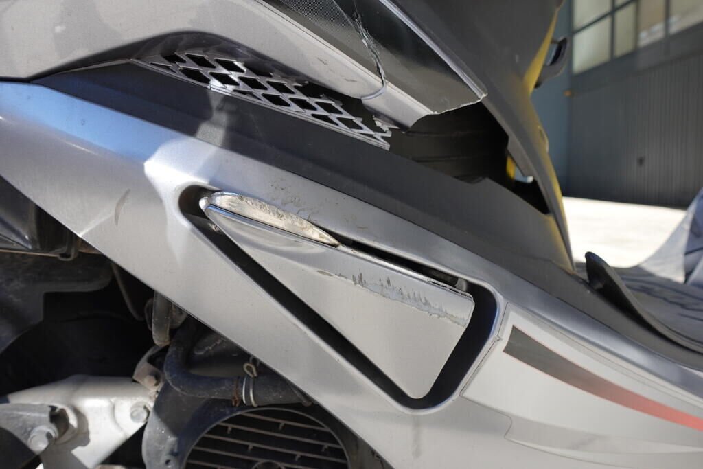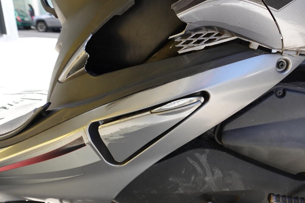Carénage latéral arrière droit, poignée passager, protection thermique échappement, échappement, cale-pied passager droit, rétroviseur droit, embout de guidon droit, levier frein avant, poignée accélérateur, pare-brise, carénage avant droit, bas de caisse droit, pare-boue avant; endommagés.