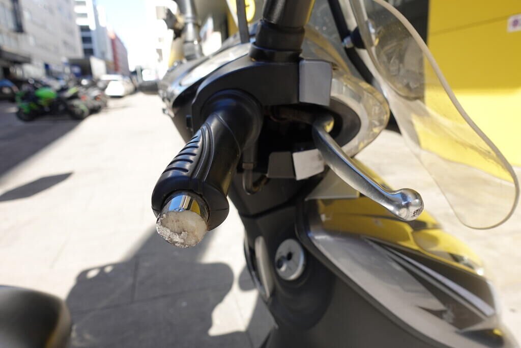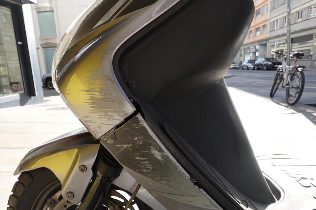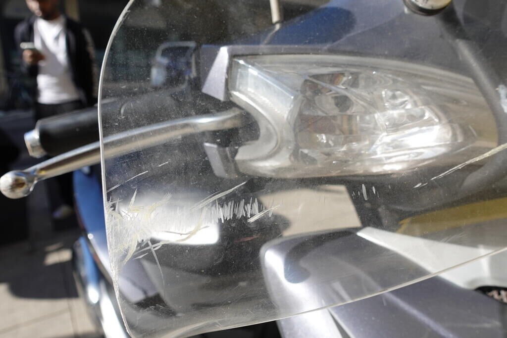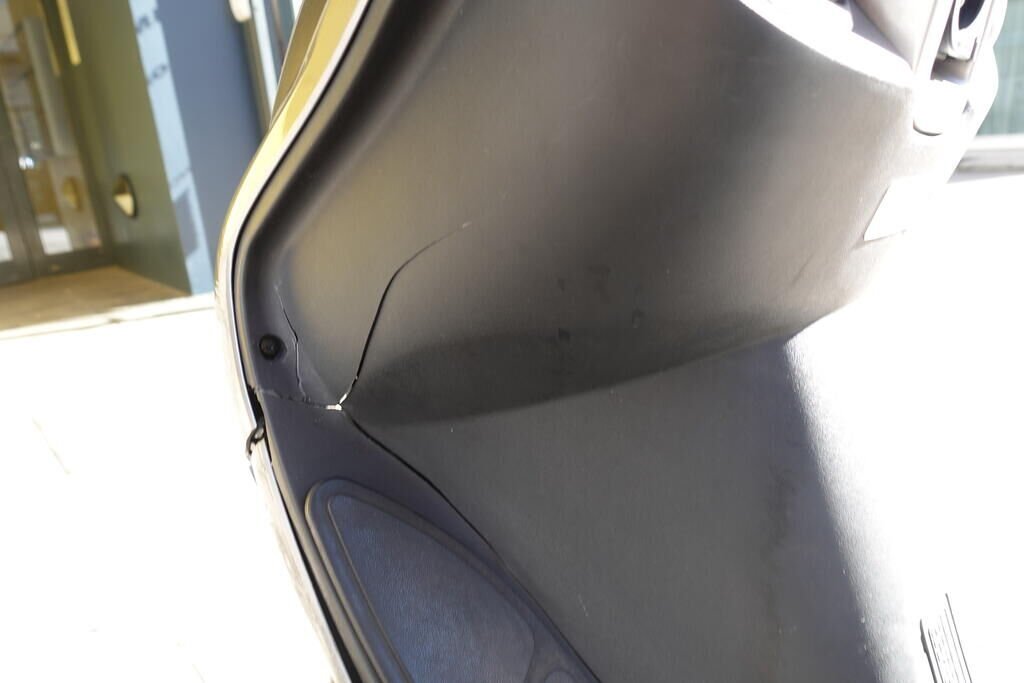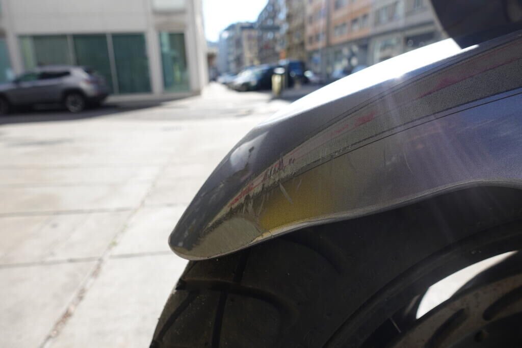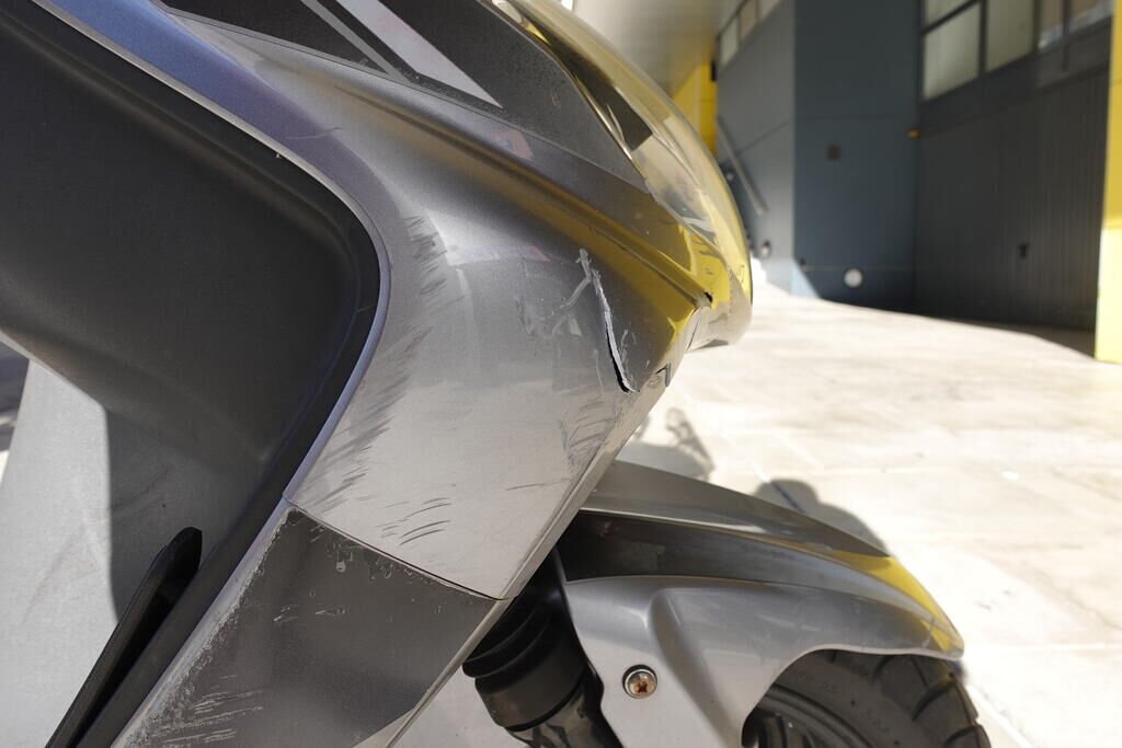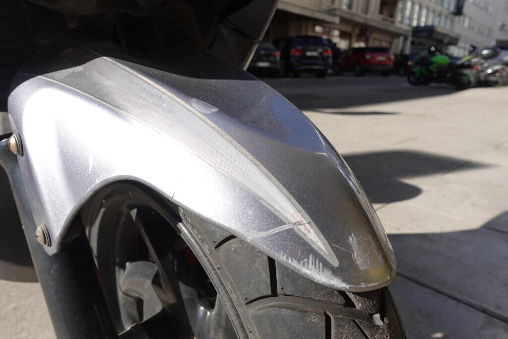 Carénage latéral arrière droit, poignée passager, protection thermique échappement, échappement, cale-pied passager droit, rétroviseur droit, embout de guidon droit, levier frein avant, poignée accélérateur, pare-brise, carénage avant droit, bas de caisse droit, pare-boue avant; endommagés.