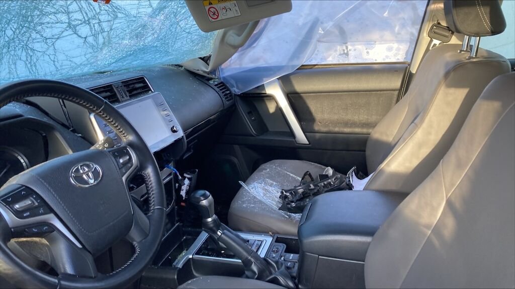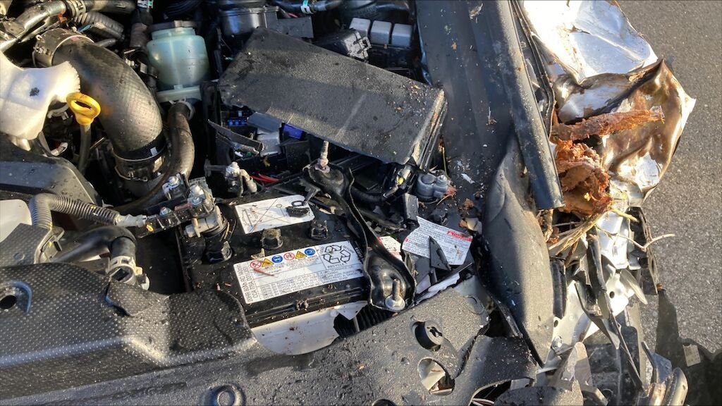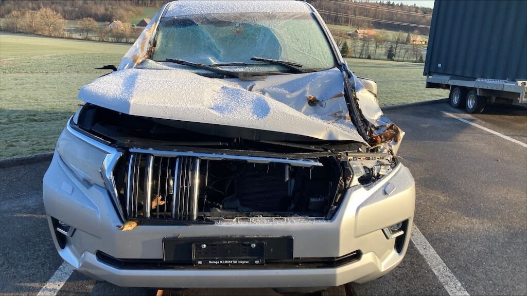 Zone avant: capot, par choc, phare gauche, tôle fronale suzpérieur gauche, joue d'aile gauche, batterie, boîte à fusible, calandre, montants du par brise, par brise, porte gauche, aile gauche, deux retroviseur, vitre droite, porte droite, porte gauche, enfoncés, déformés fortement. Voiture ne démarre pas.