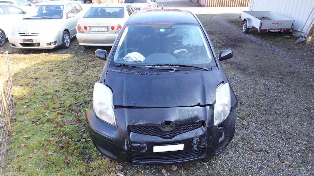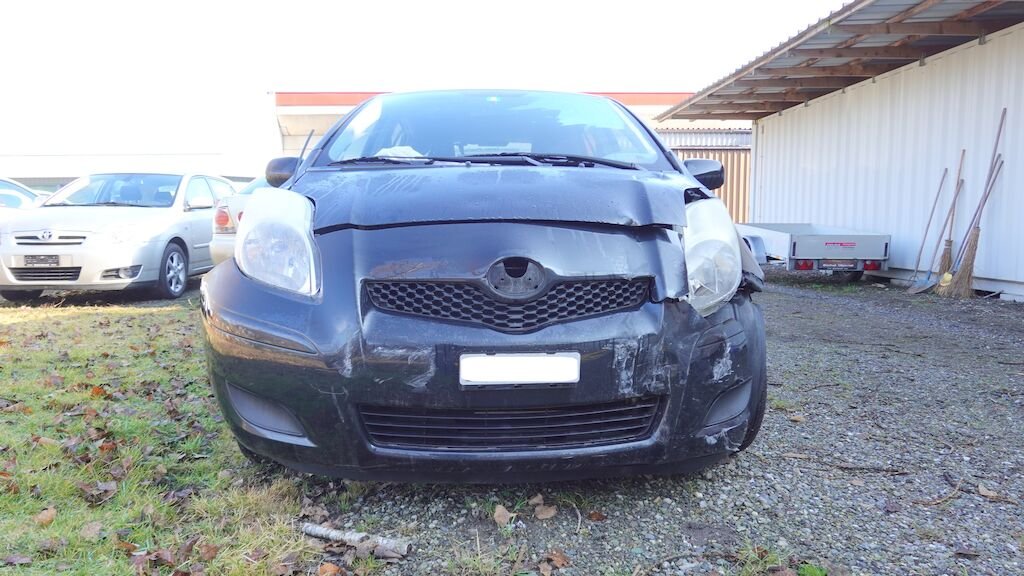 Stossstangenabdeckung, Kühlergrill und Scheinwerfer links gerissen. Motorhaube, Kotflügel und Schlossträger eingedellt und verformt.