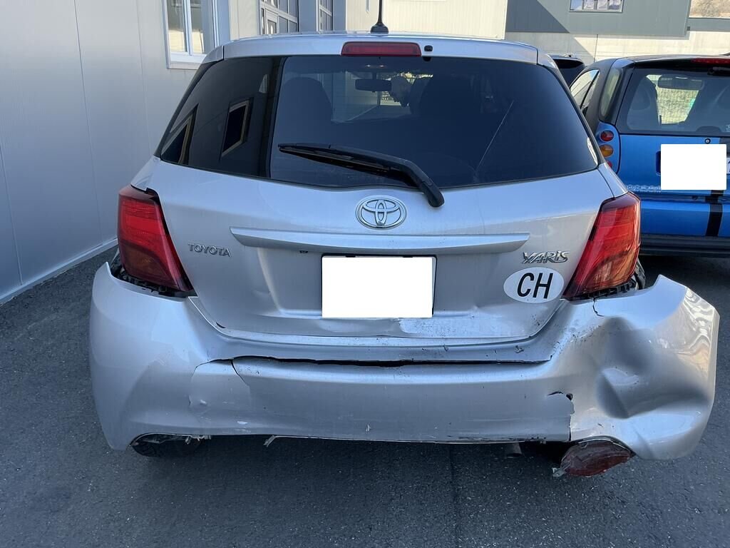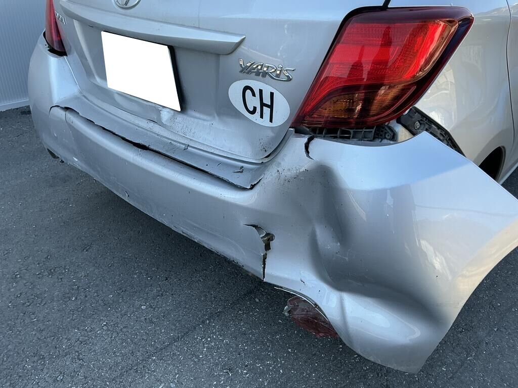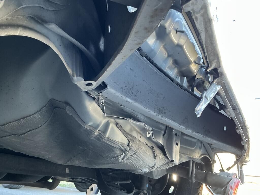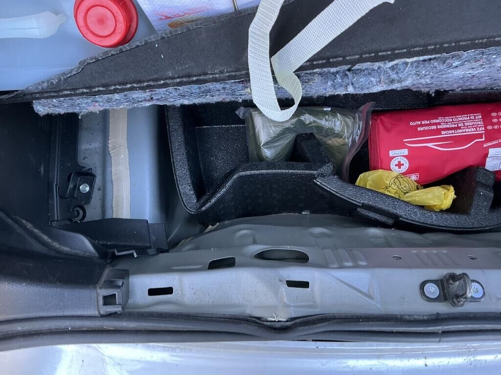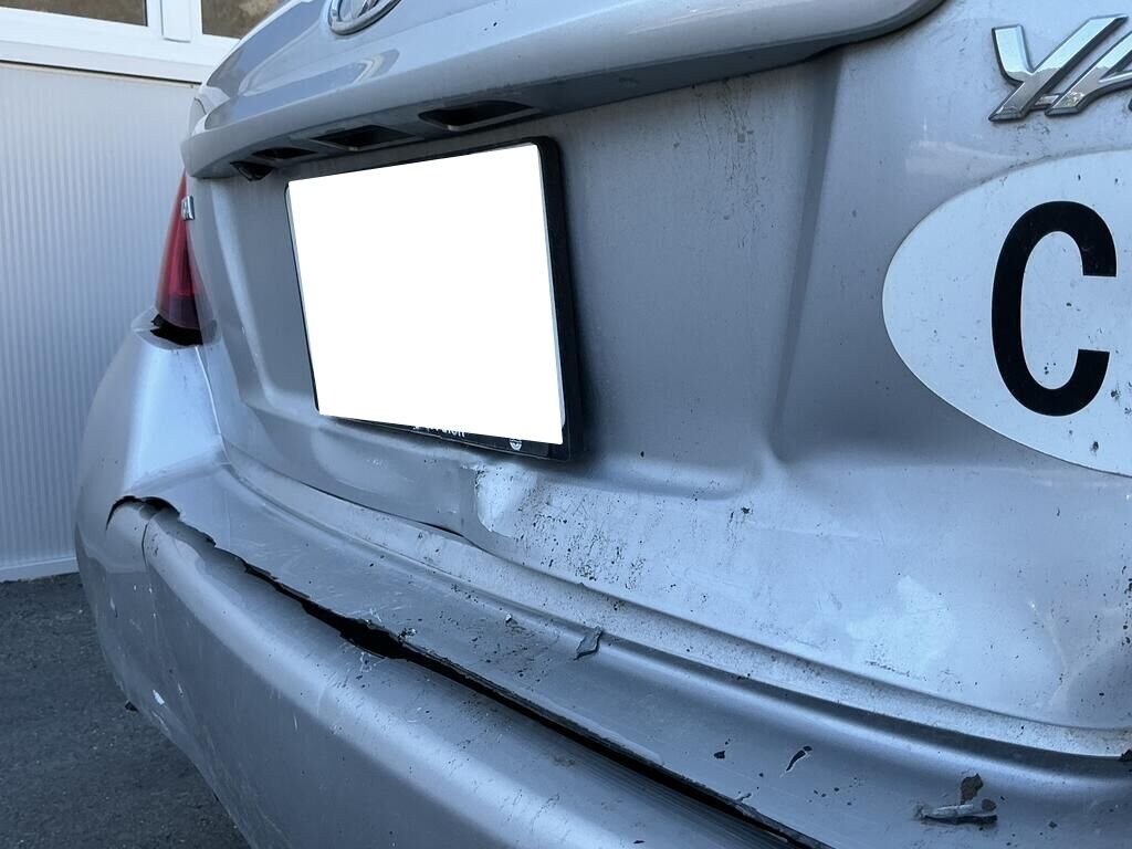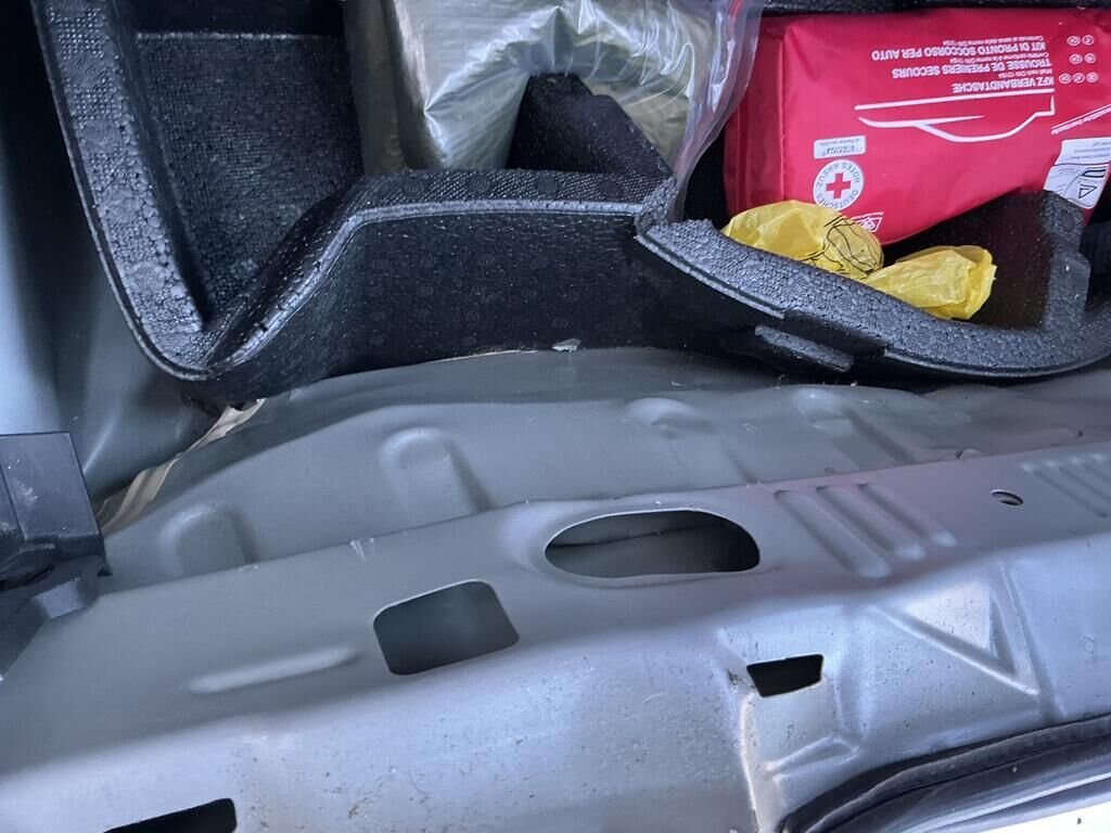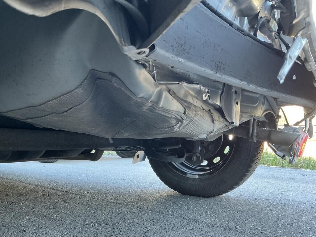 Bac roue de secours, garniture seuil de coffre, pare-chocs arrière et feux brouillards cassés.