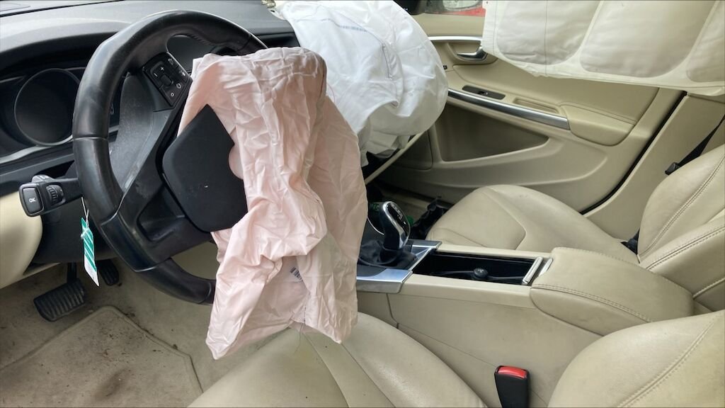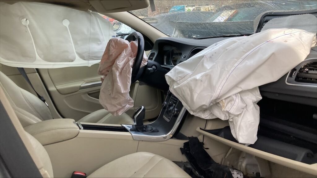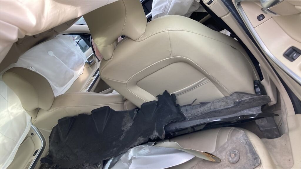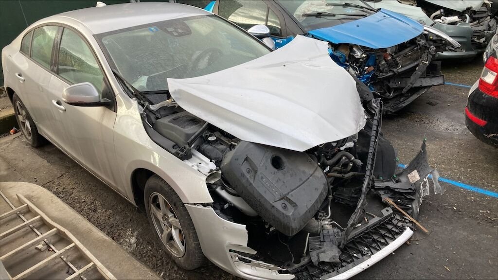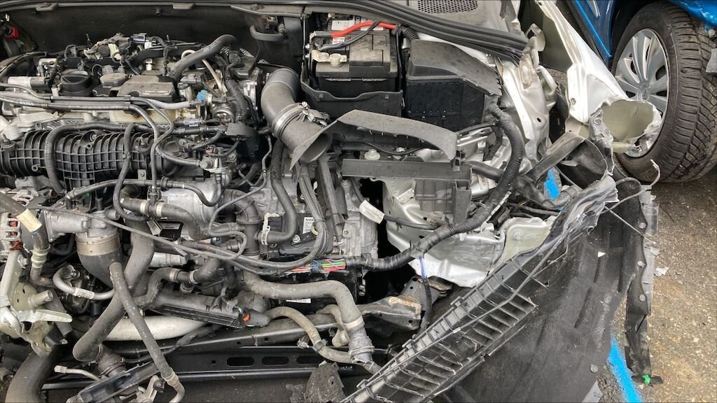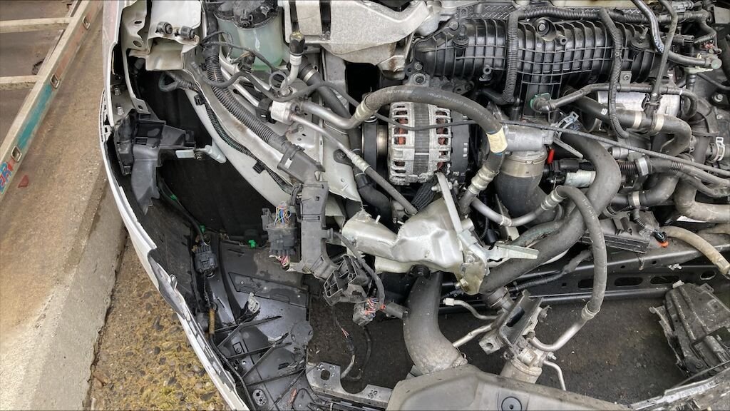 Mécanique avant gauche refoulée. Par brise cassé, 4 airbags et ceintures déclenchés. Jante arrière gauche et pneus abîmés, moteur ne démarre pas.