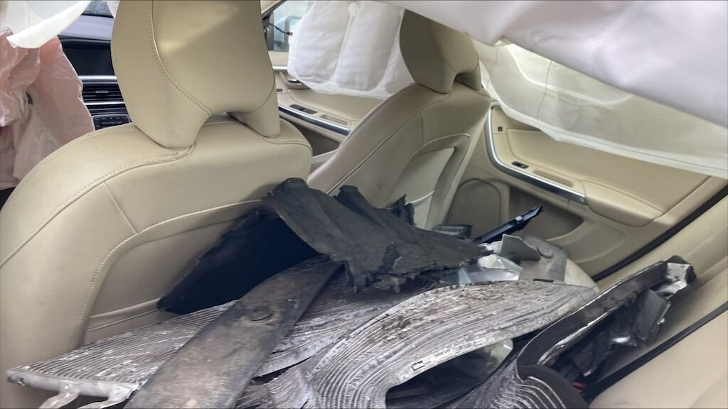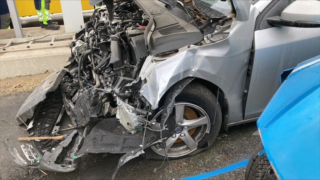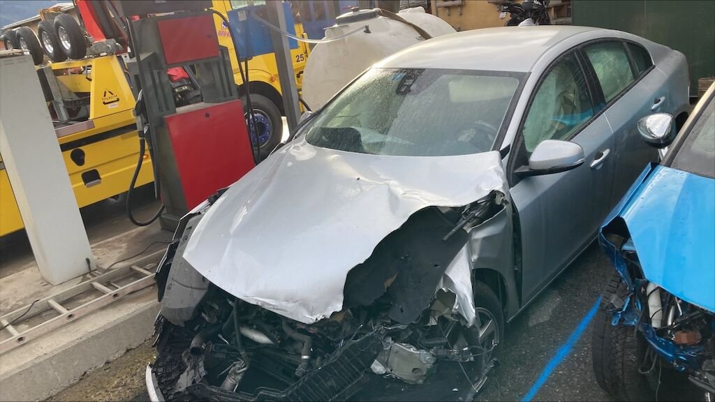Zone avant: choc important sur la face avant, radiateur, longeron, joues d'ailes, capot, ailes, berceau, compresseur, radiateurs, tôle frontale fortement refoulés.