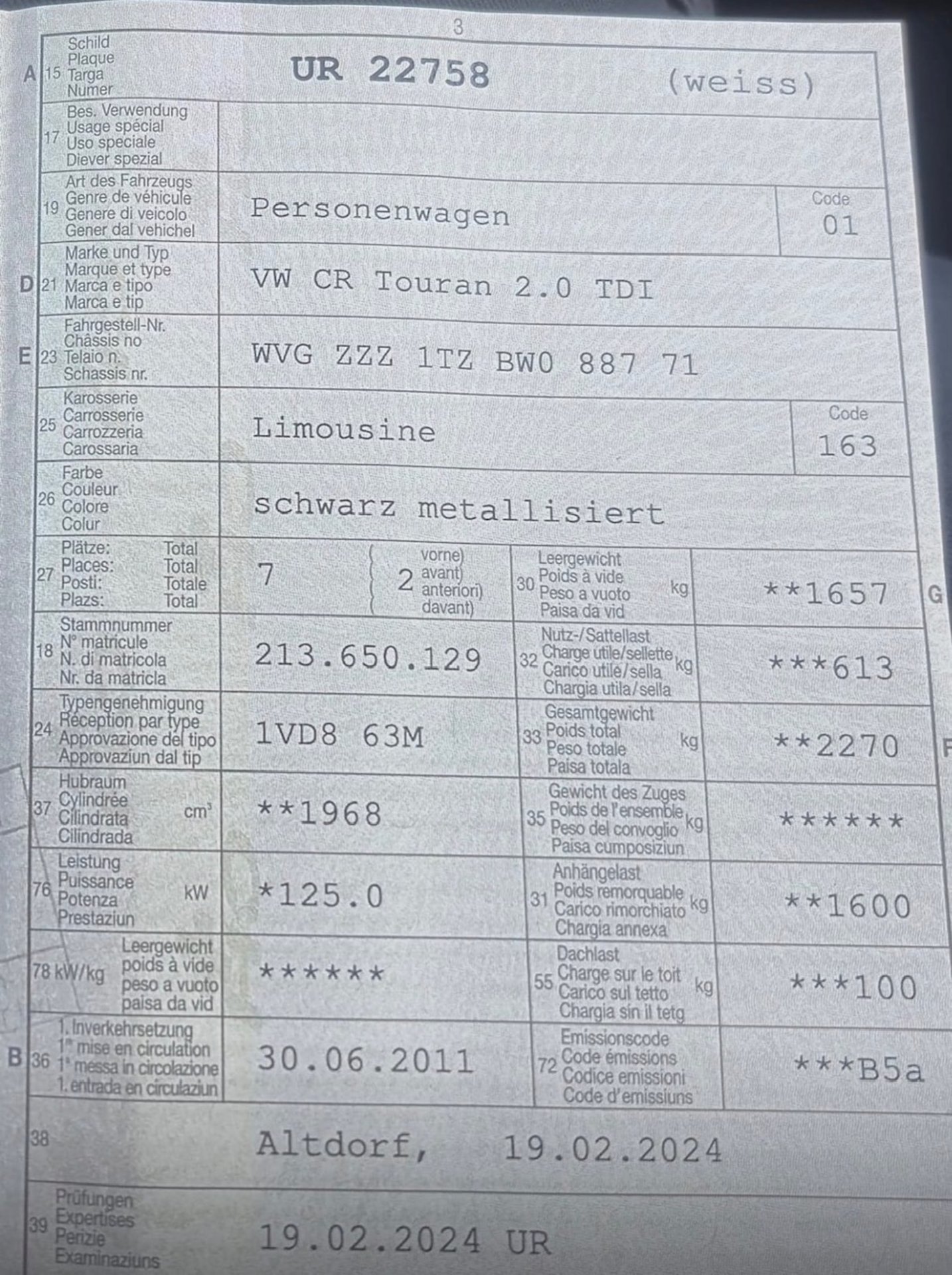 2011 VW CR Touran 2.0 TDI