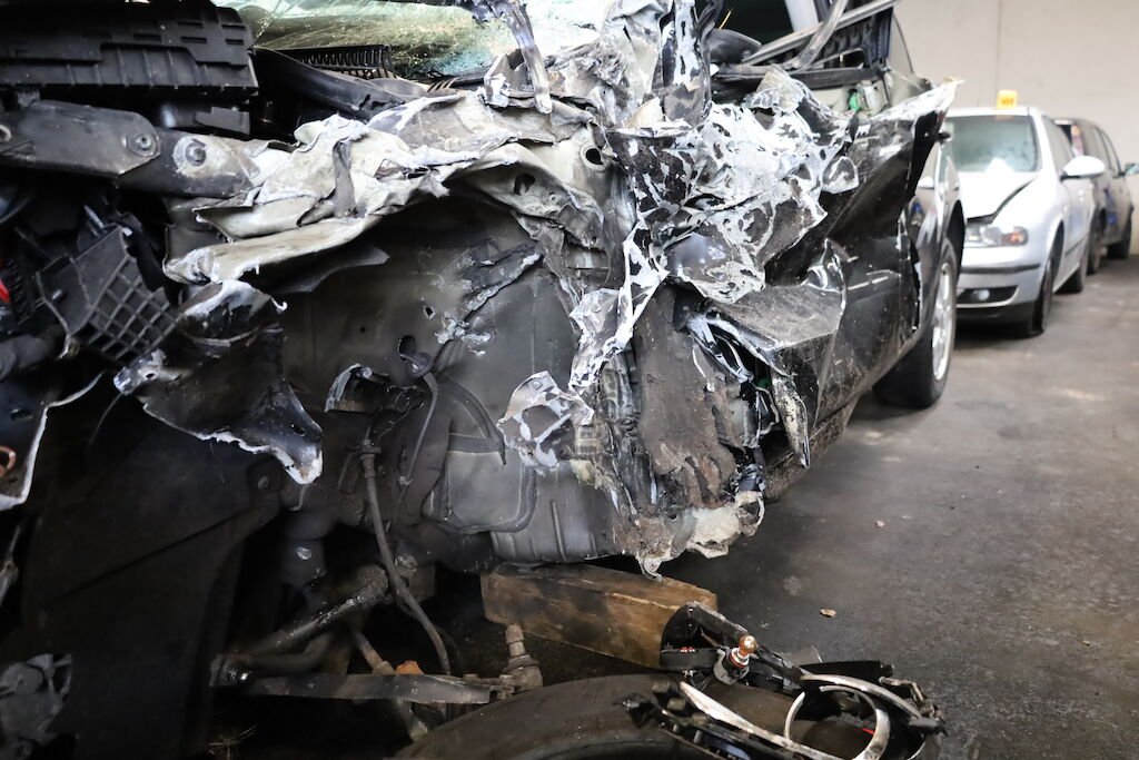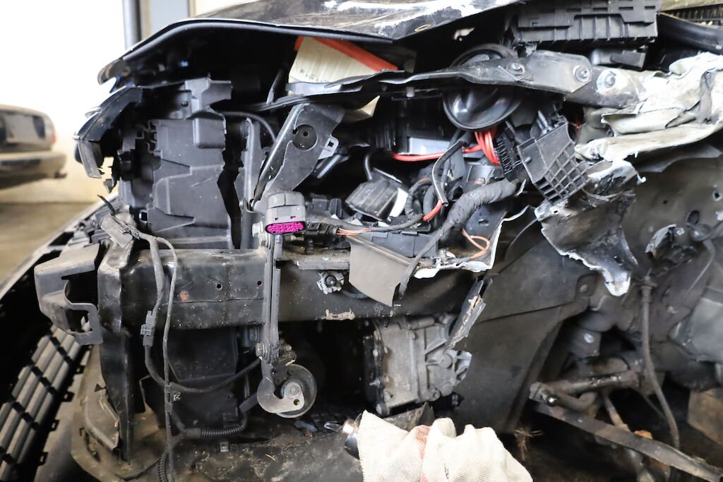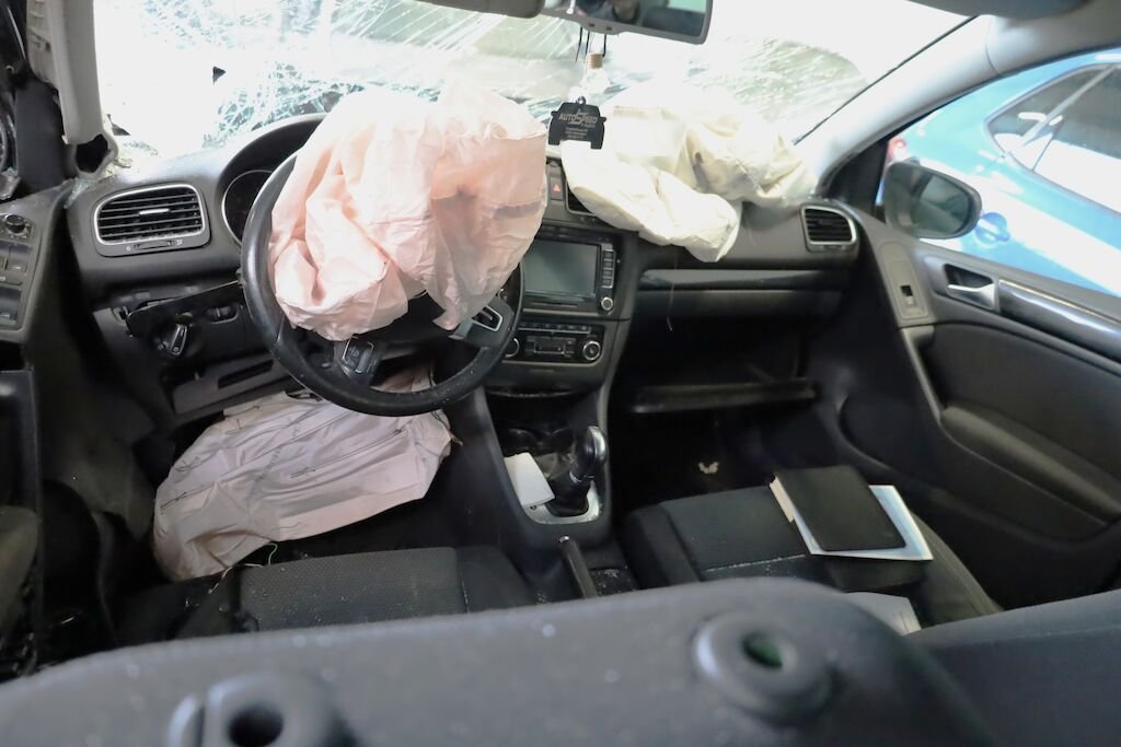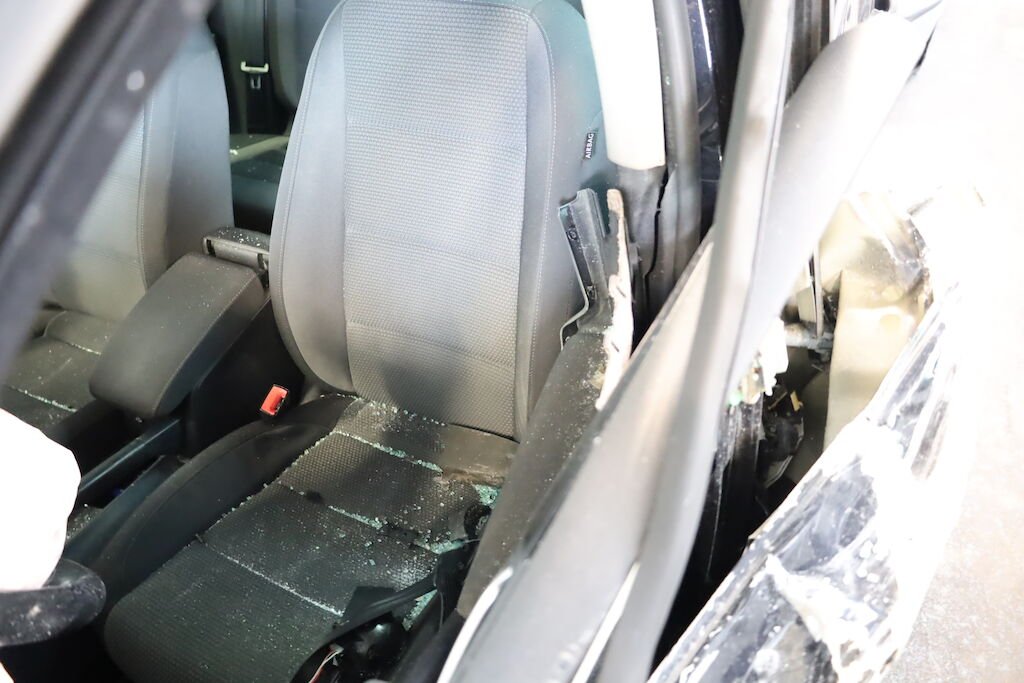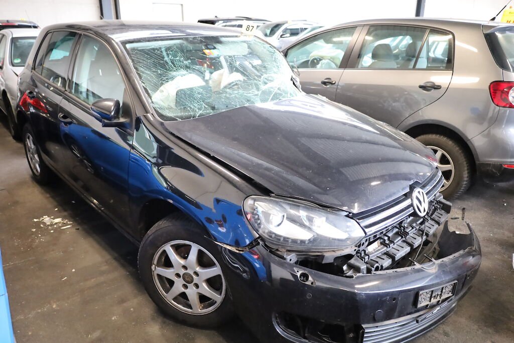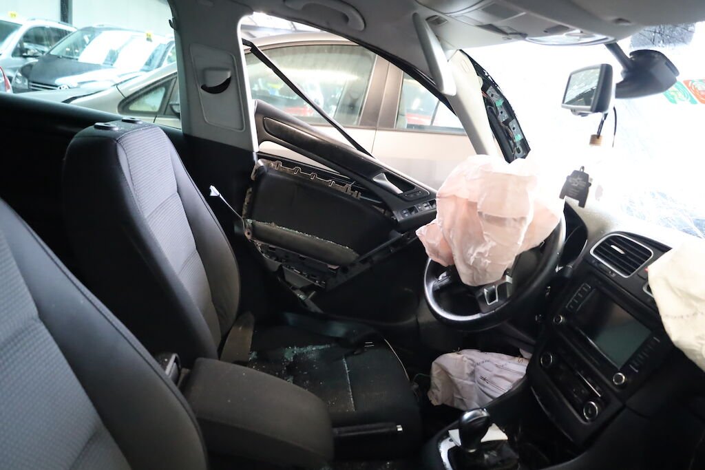Anprall an die linke vordere Fahrzeugseite mit Beschädigung von sämtlichen Karosserieanbauteilen, Tür vorne und hinten, Schweller, A-Säule, Dachrahmen, Frontscheibe, Bodenblech sowie Radaufhängung vorne links. Ebenfalls wurden elektrische Komponenten beschädigt. Auch wurden die Frontairbags sowie die Gurtstraffer ausgelöst. Armaturentafel gestaucht.