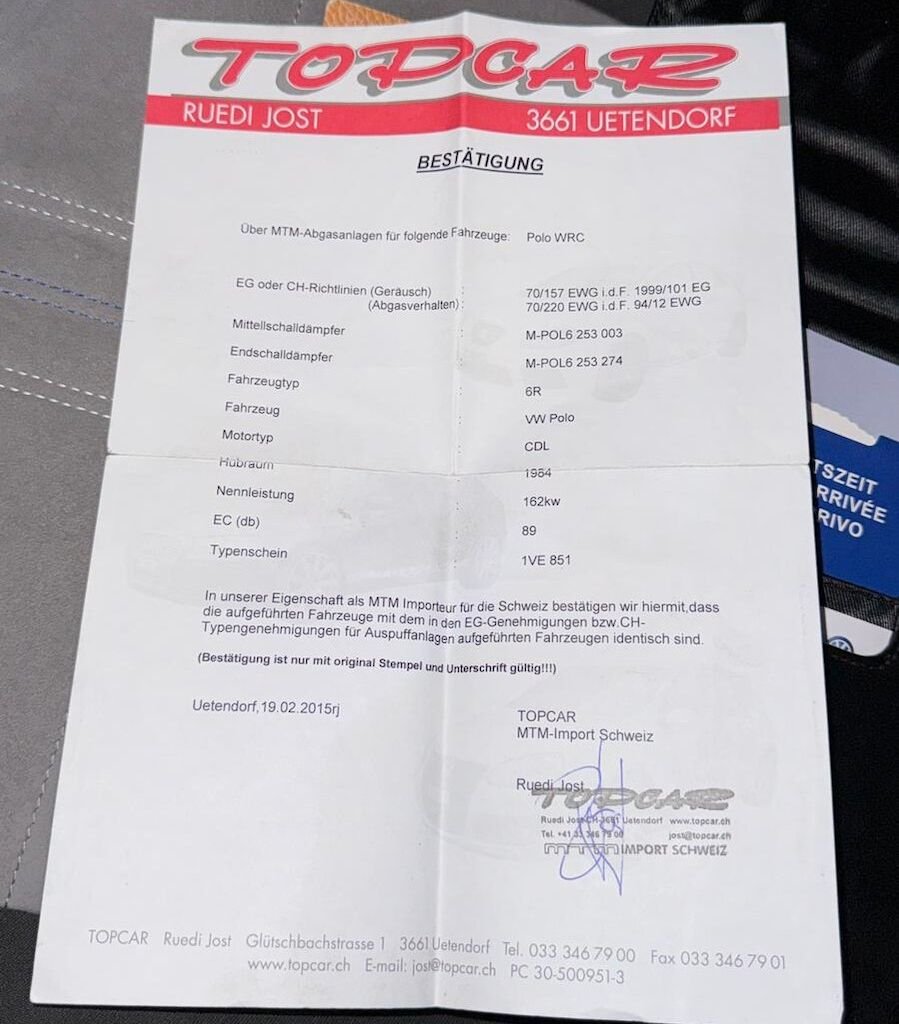 MTM-Abgasanlage verbaut, Beiblatt vorhanden, nicht eintragungspflichtig