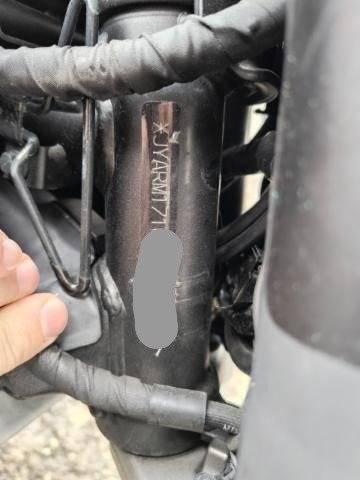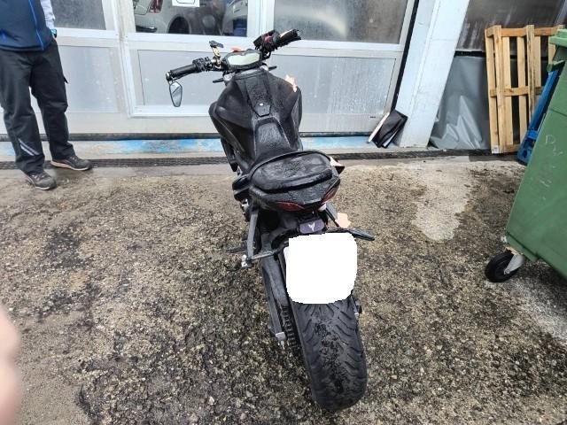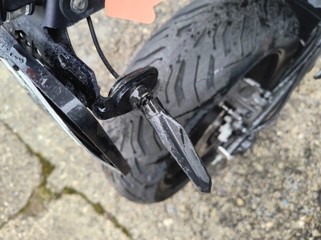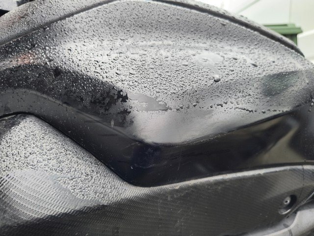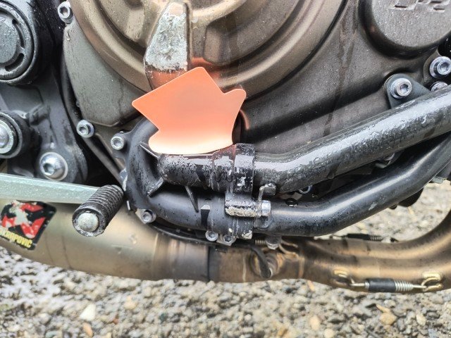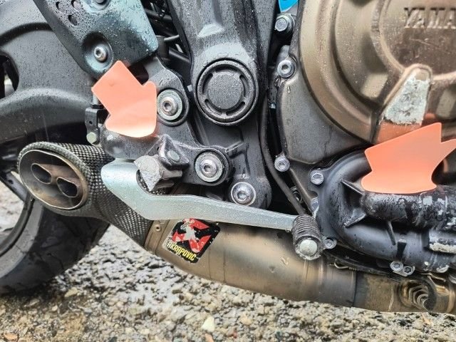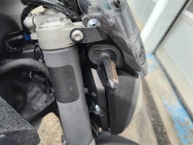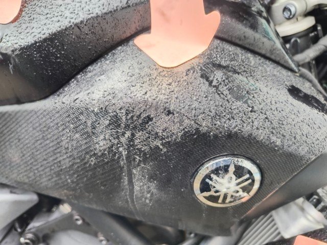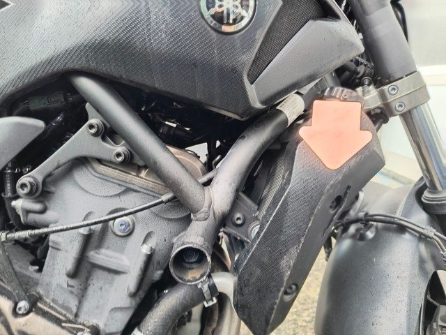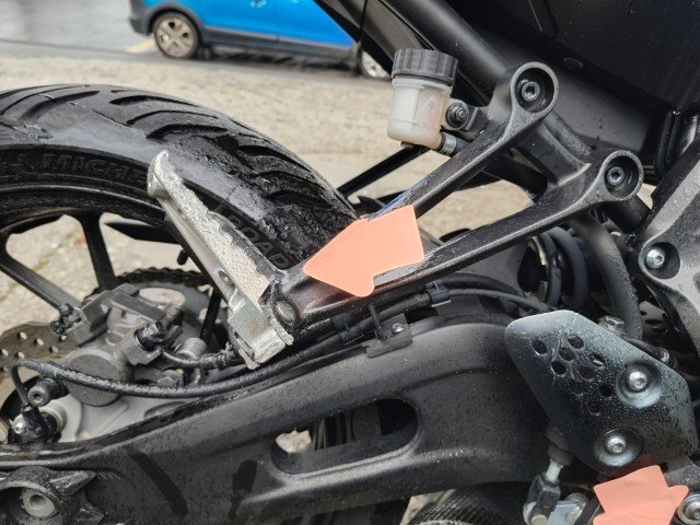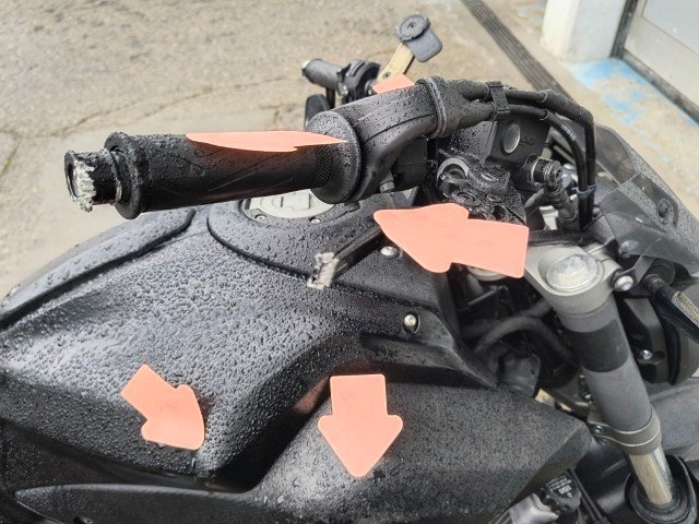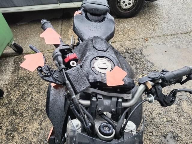 Gabel rechts – Lenker + Tachohalterung + Bremshebel rechts + Rückspiegel rechts – Blinker vorne rechts – Seitenverkleidung rechts – Tankverkleidung rechts – Kühlerverkleidung rechts – Rahmen - Motorverkleidung + Kühlwasserleitung - Bremspedal + Fußrasten - Hintere Fußrasten rechts + Halterung - Hinterer Kotflügel rechts - Blinker hinten rechts - Motorverkleidung links - Tankverkleidung links.