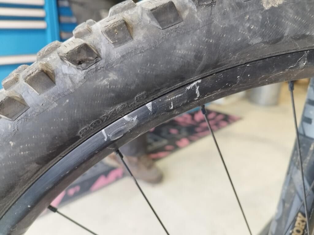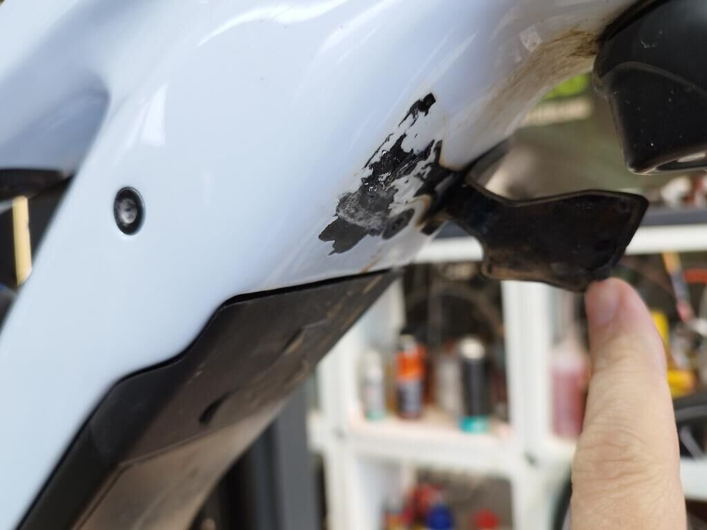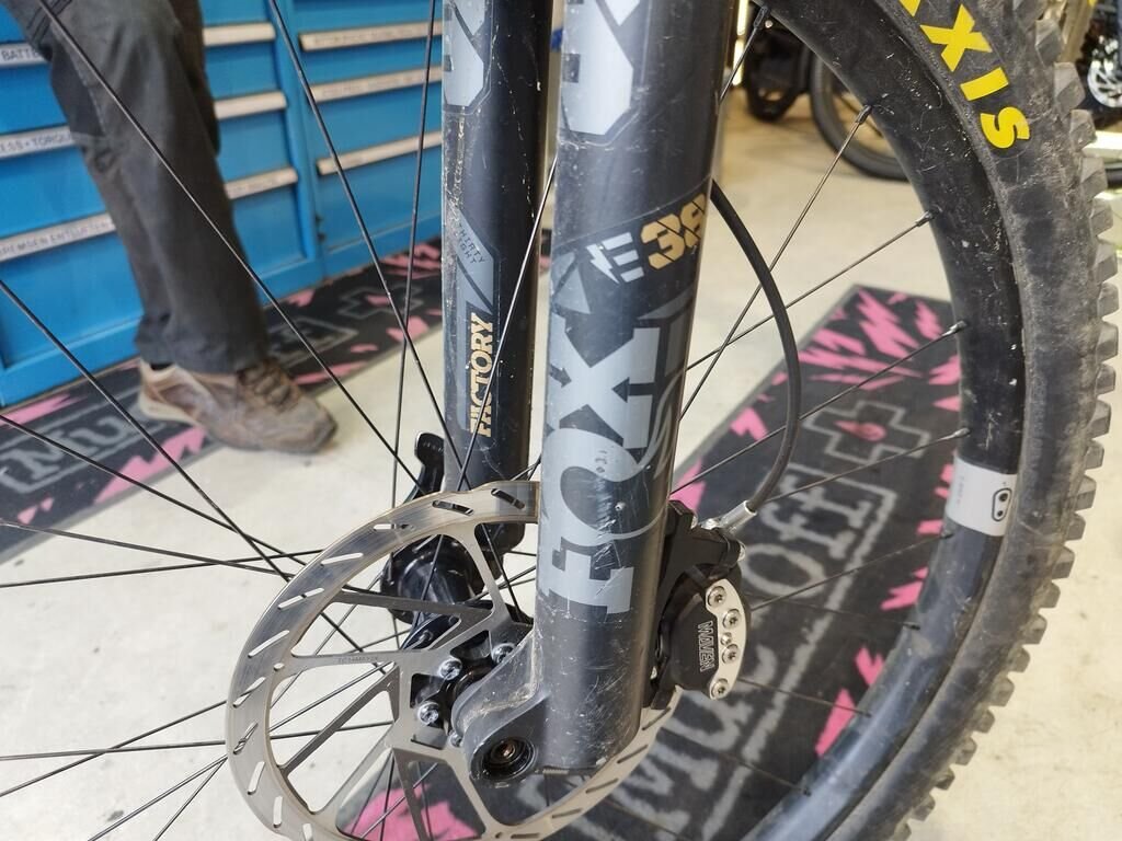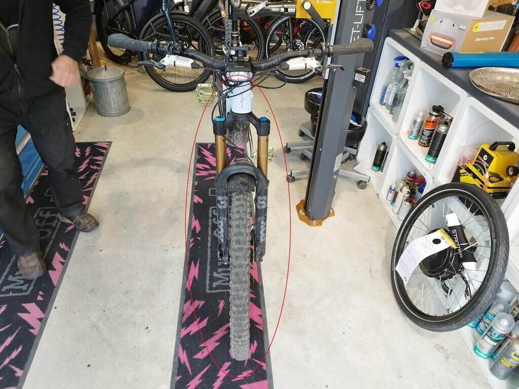 Das Rad vorne ist beschädigt, die Frontgabel ist beschädigt, der Rahmen ist deformiert.